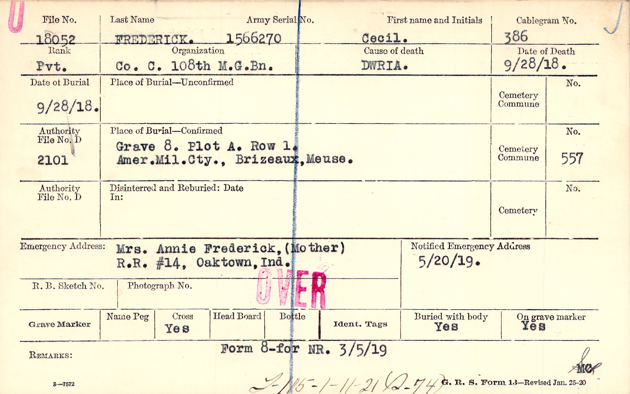 Mrs. Annie Frederick, (Mother), R.R. #14, Oaktown, Ind.