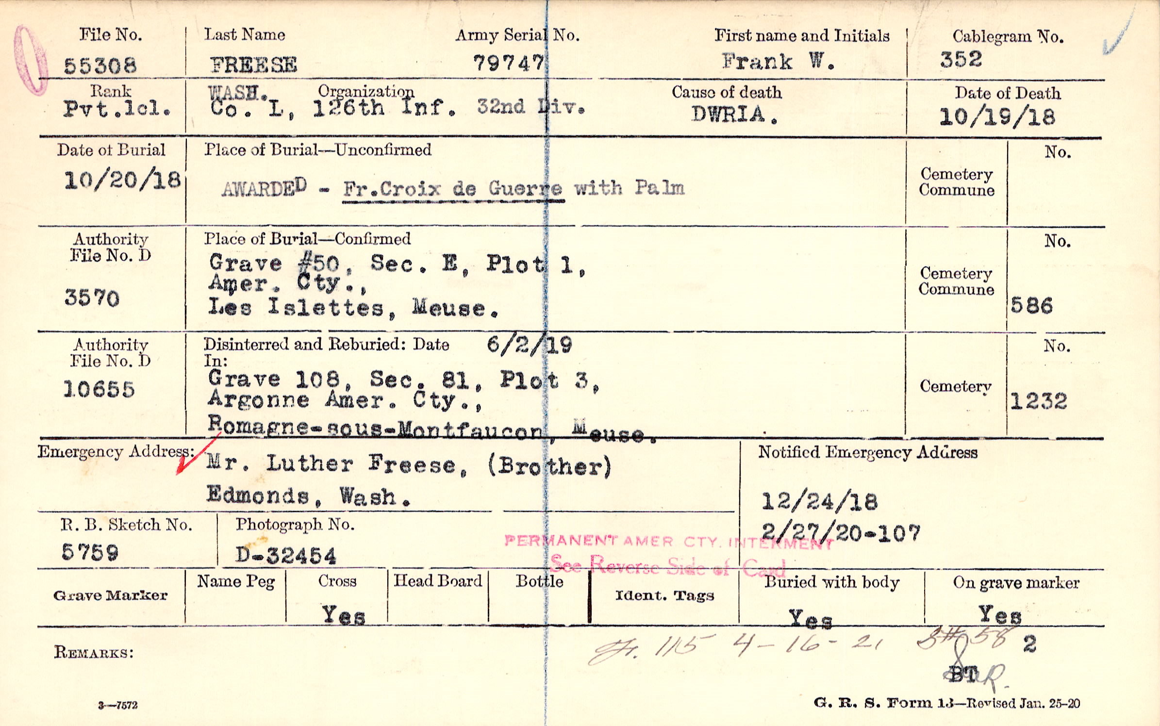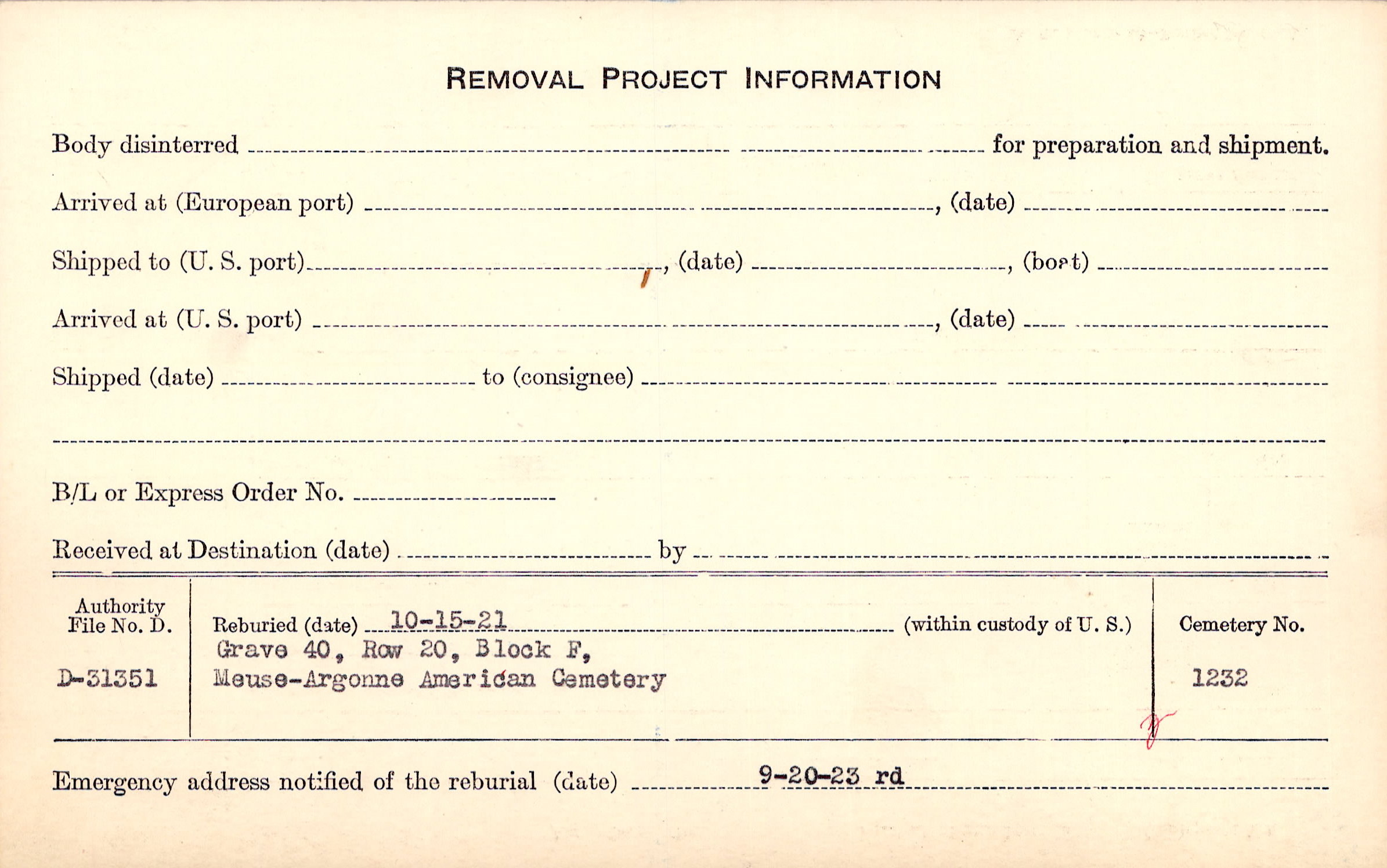 Grave 108, Section 81, Plot 3, Argonne American Cemetery, Romagne-sous-Montfaucon, Meuse