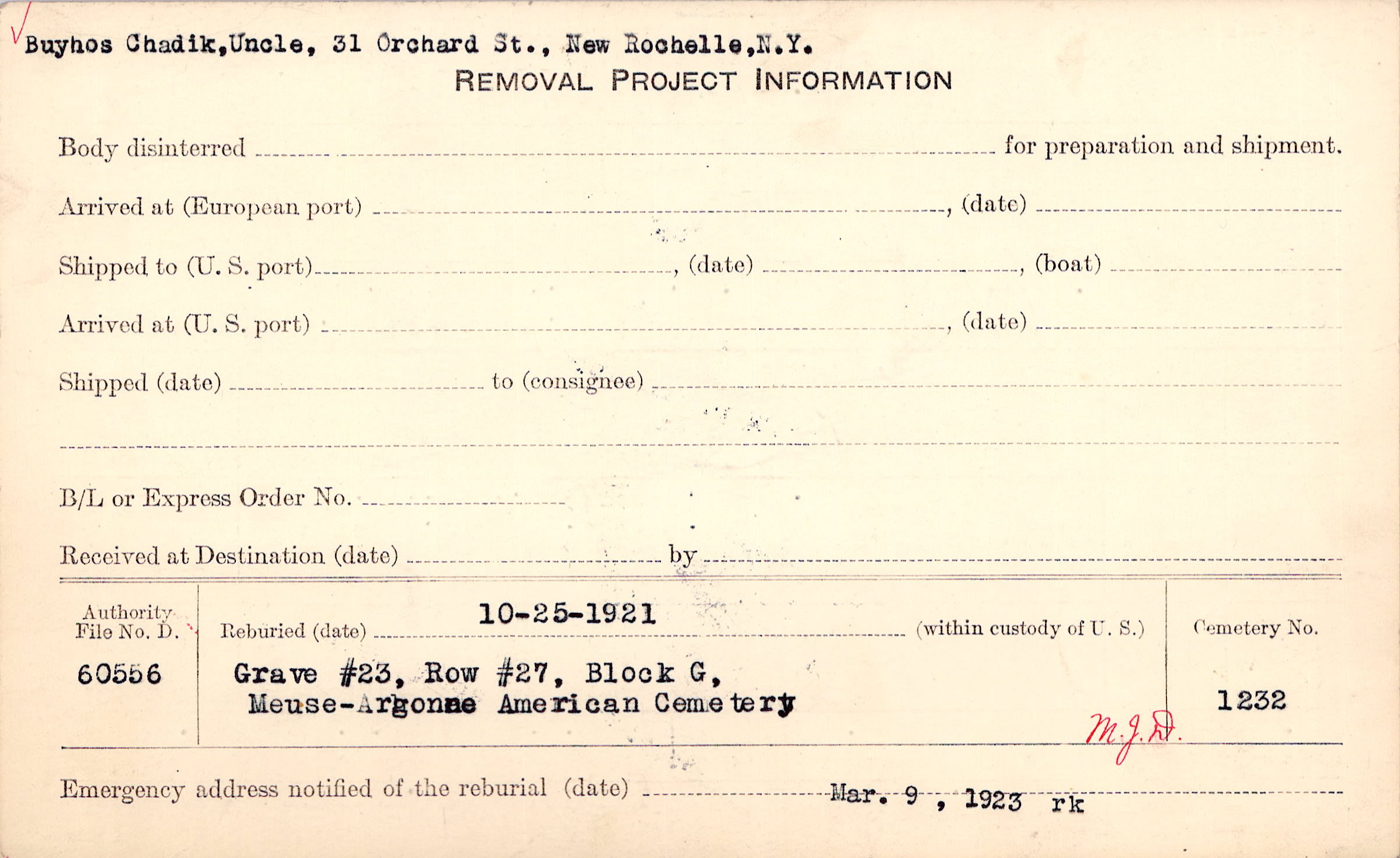 Buyhos Chadik, Uncle, 31 Orchard St., New Rochelle, N.Y. |