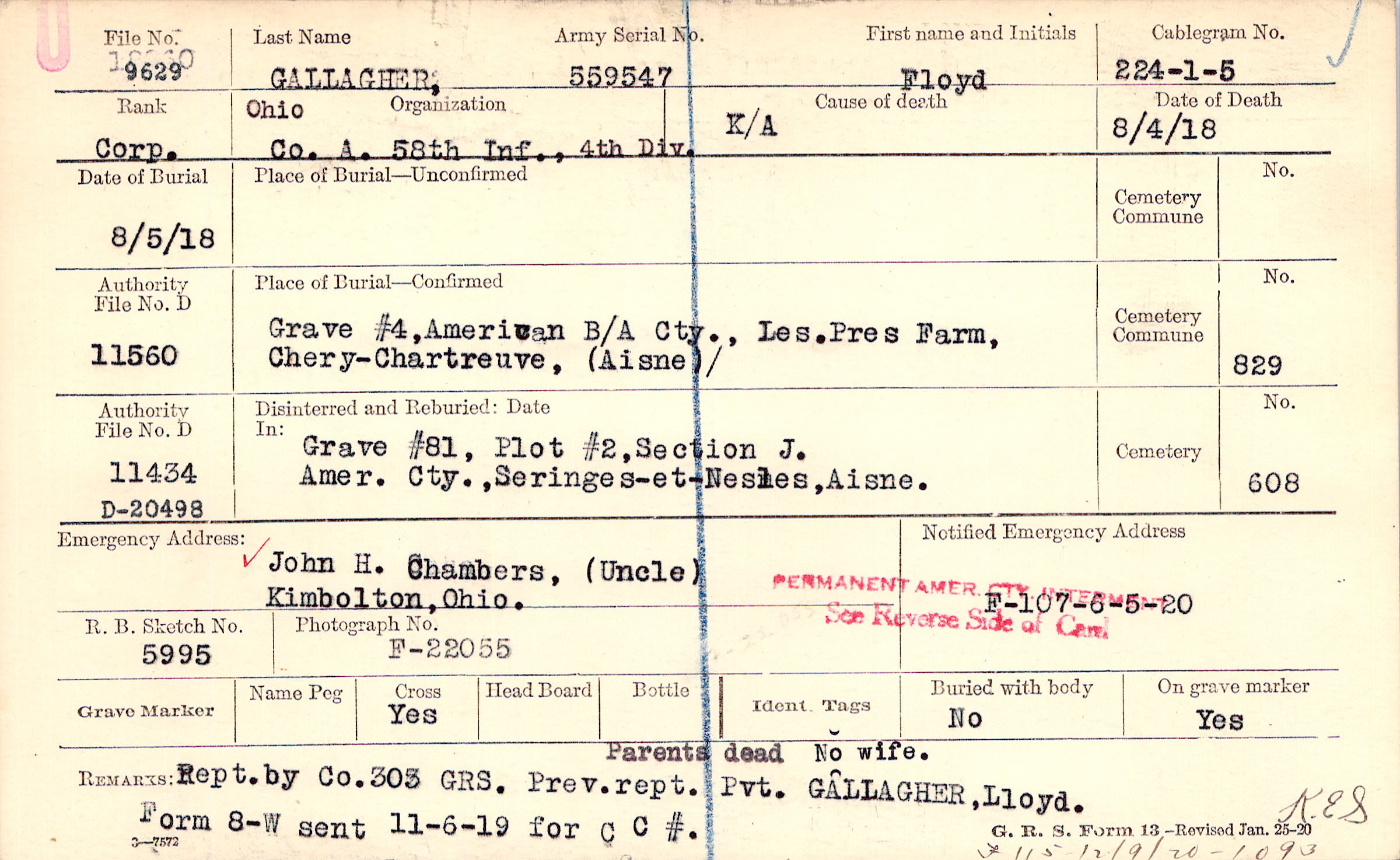Parents dead No wife. Rept. by Co. 305 GRS. Prev. rept. Pvt. Gallaghe, Lloyd F115 12/9/20 - 1093, Form 8-W sent 11-6-19 for C C #., F115 12/9/20 - 1093