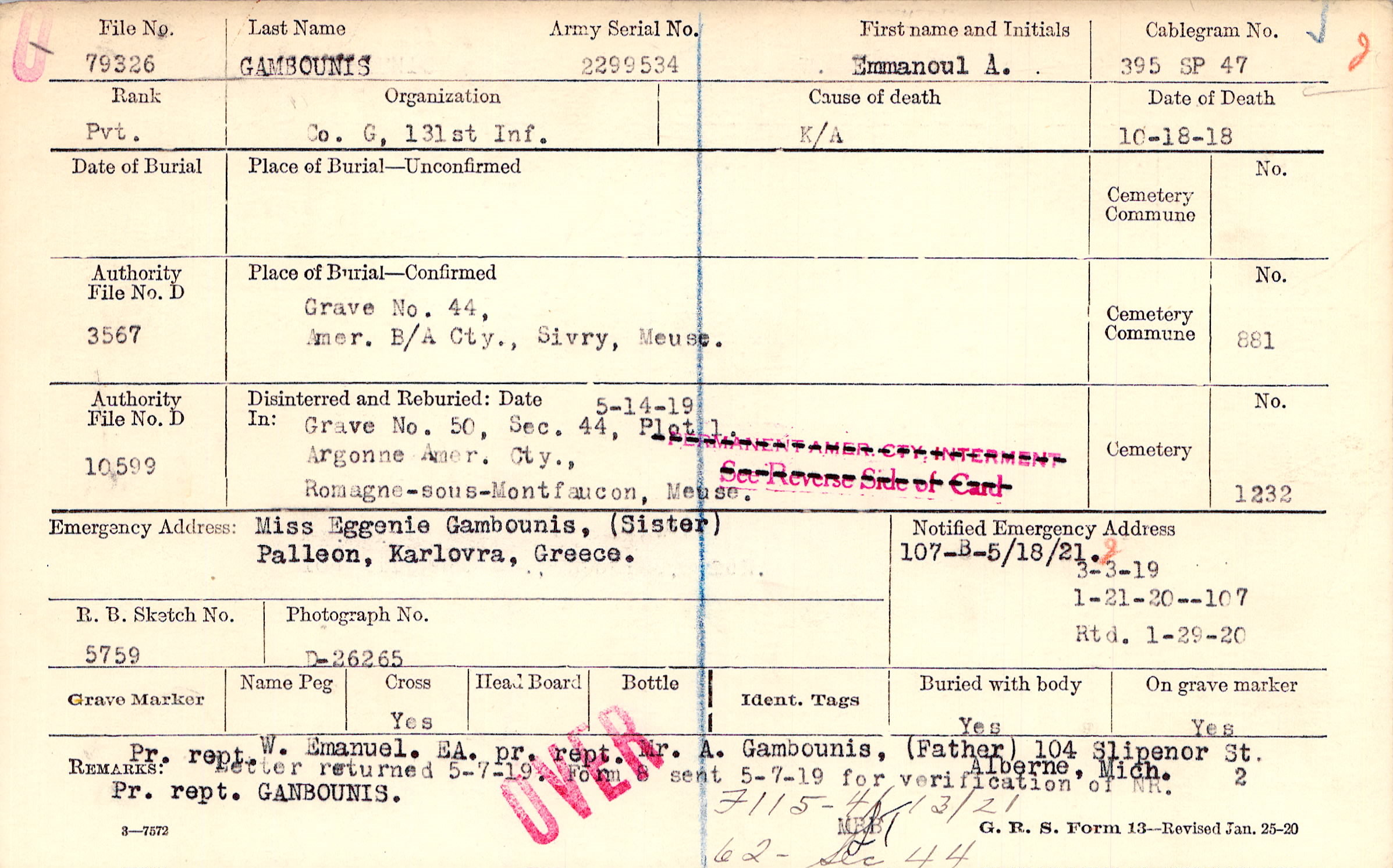 W. Samuel EA. pr. rept. Mr. A. Gambounis, (father) 104 Slipenor St. Alberne, Mich. Letter returned 5-7-19 Pr. rept. GANBOUNIS 2, Form 8 sent 5-7-19 for verification of NR., F115 - 4/13/21 62 - Sec 44