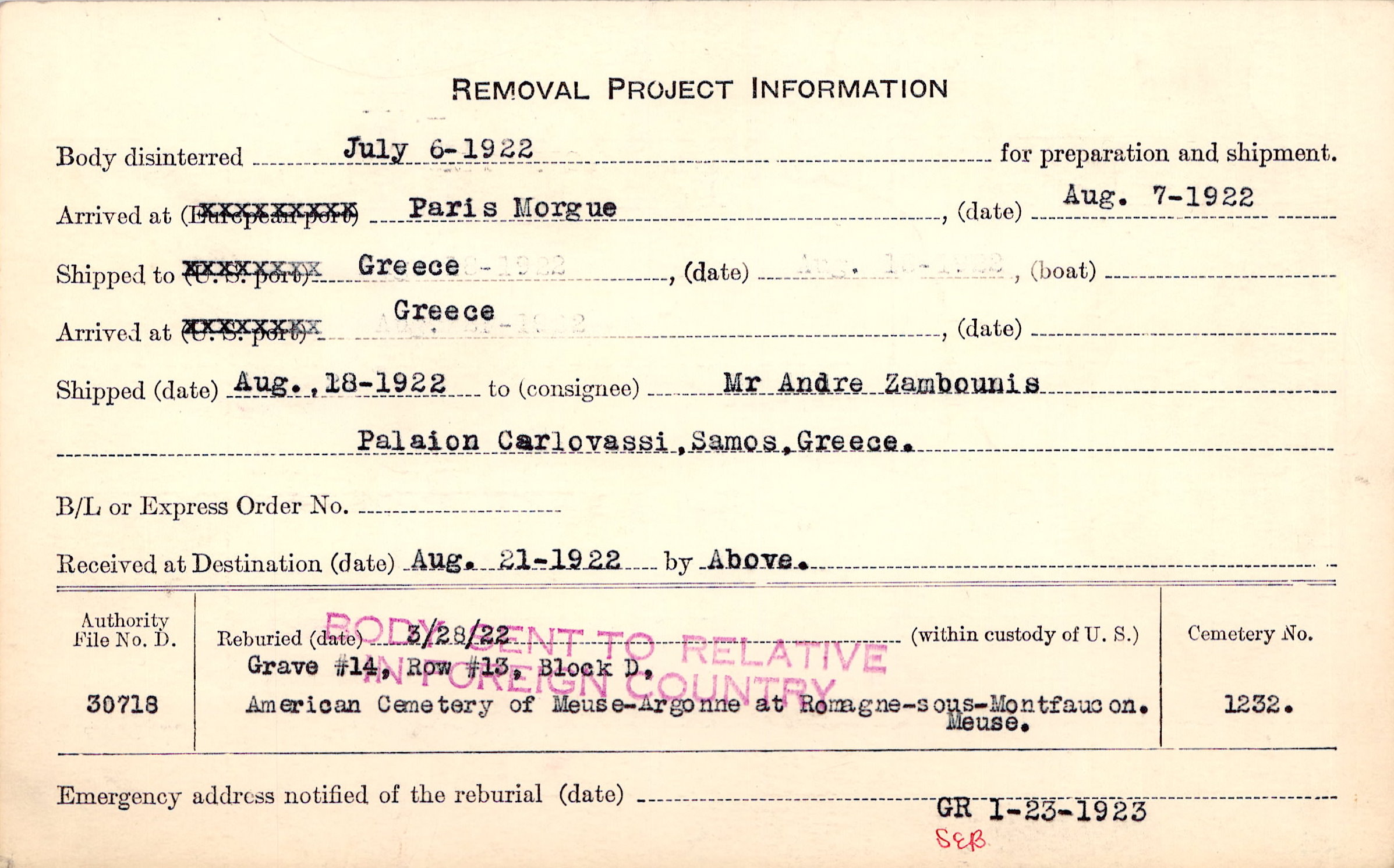 Miss Eggenie Gambounis, (Sister), Palleon, Karlovra, Greece., EA. pr.rept. Mr. A. Gambounis, (Father) 104 Slipenor St., Alberne, Mich,