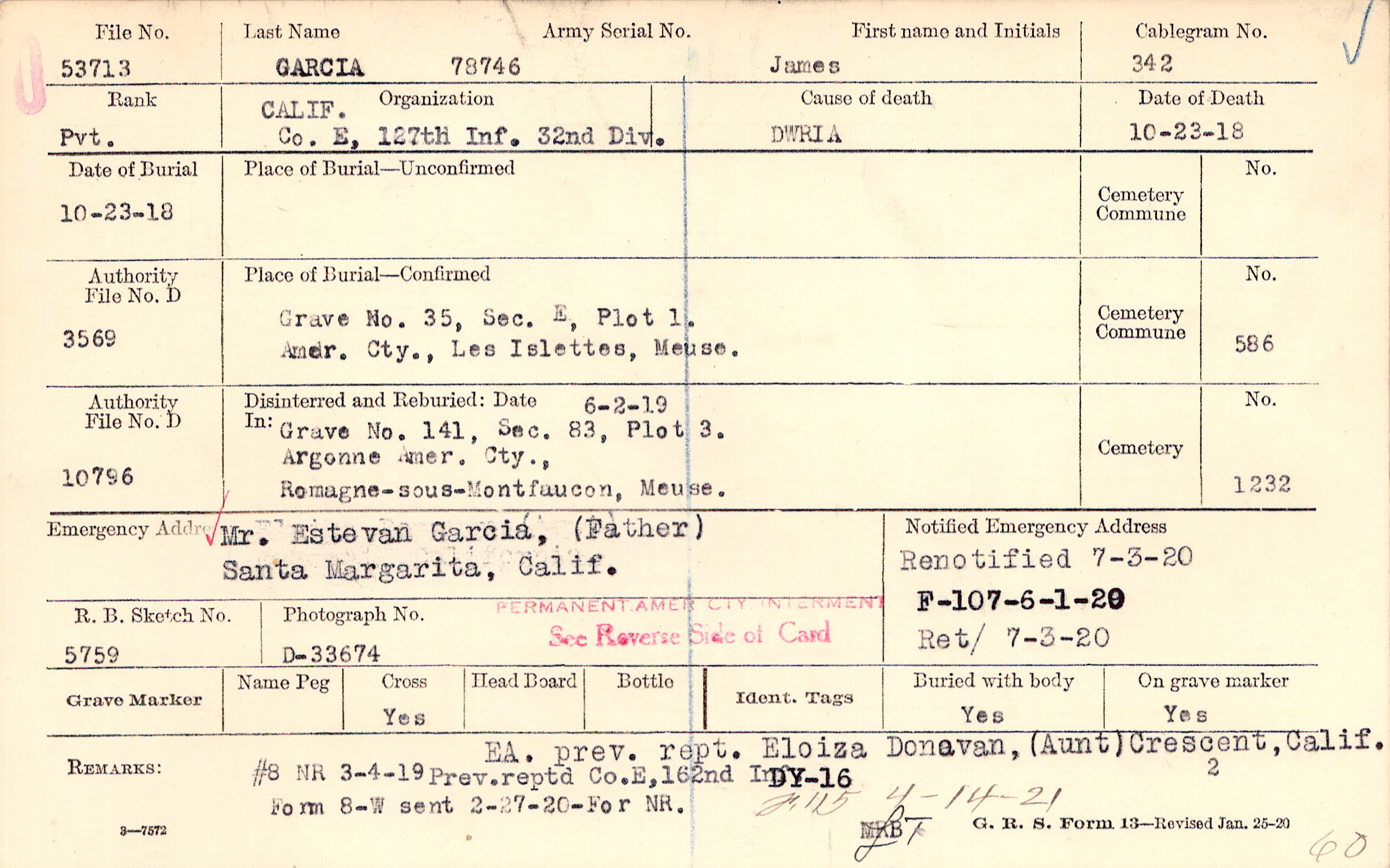 EA. prev. rept. Eloiza Donavan, (Aunt) Crescent, Calif. Prev. reptd. Co.E, 162nd Inf., #8 NR 3-4-19 Form 8-W sent 2-27-20 - For NR., F115 4-14-21 60