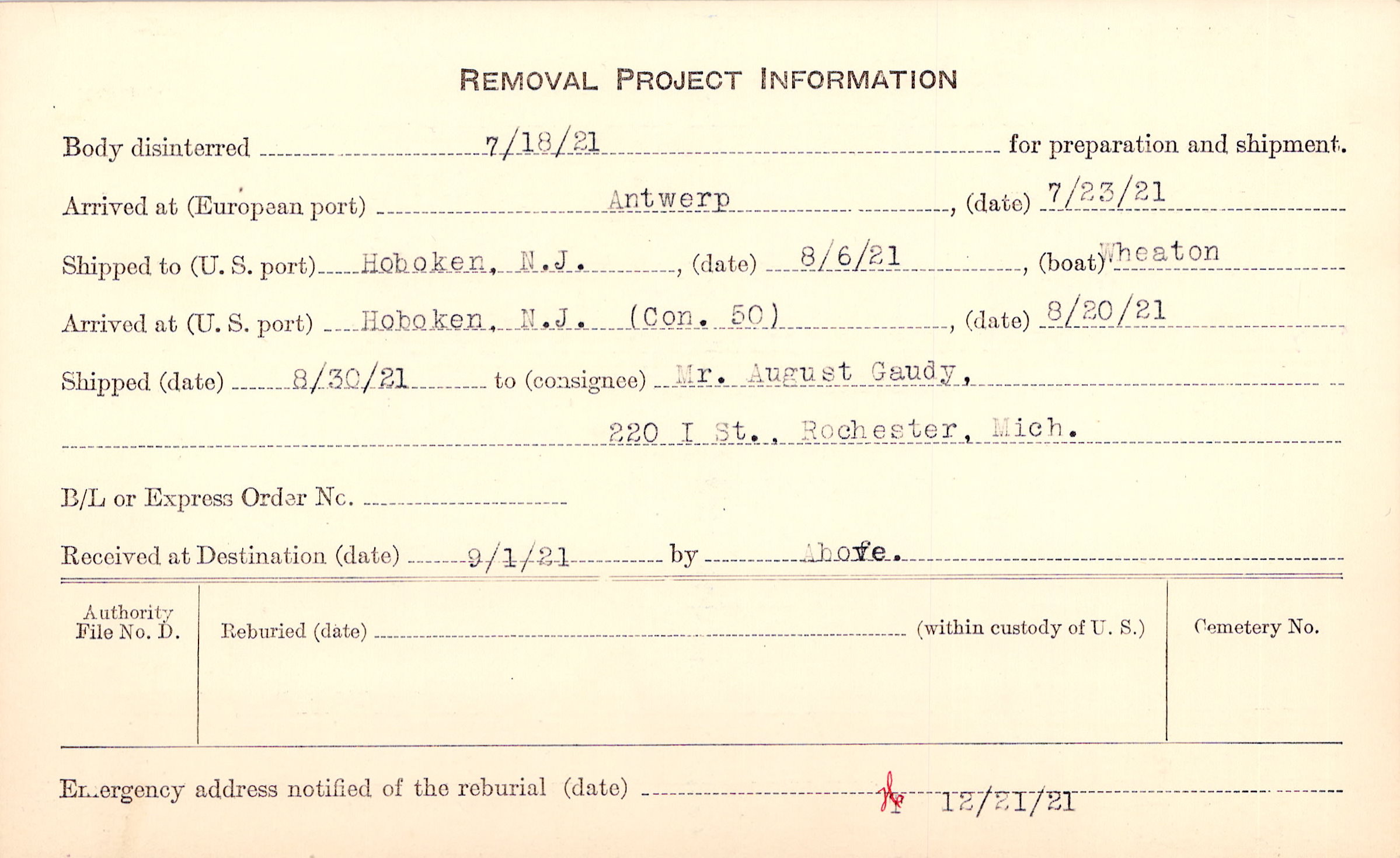 Body disinterred 7/18/1921 for preparation and shipment.