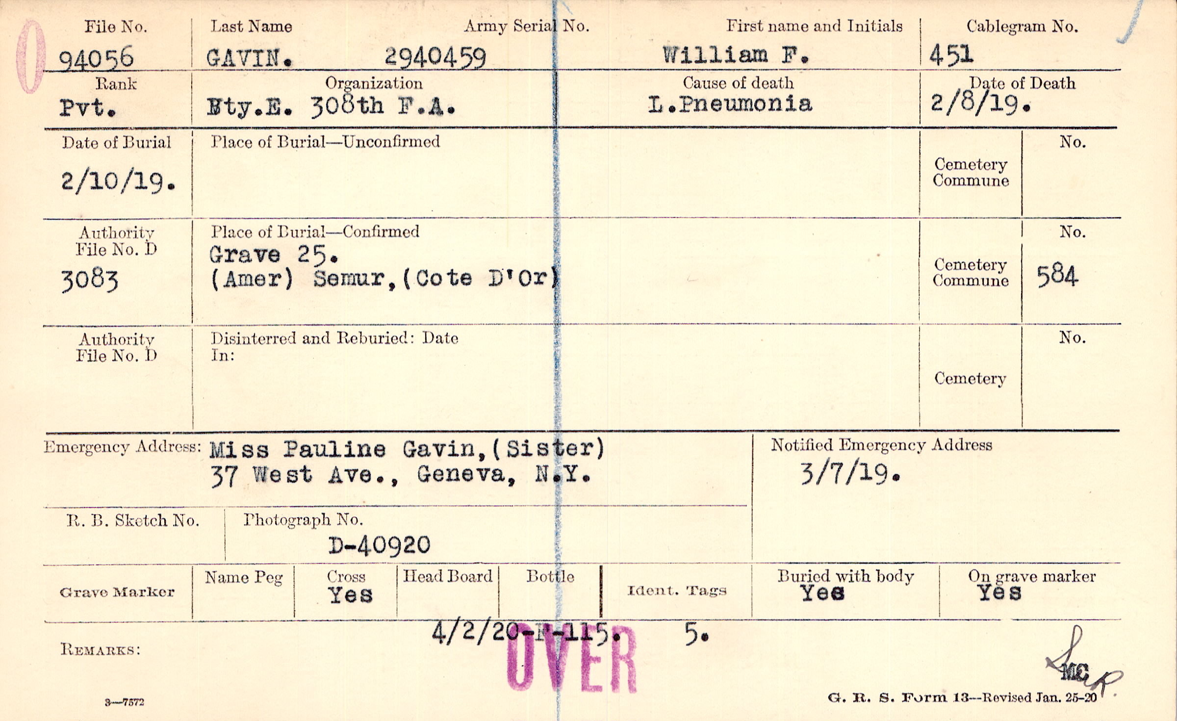 Miss Pauline Gavin, (Sister), 37 West Ave., Geneva, N.Y.