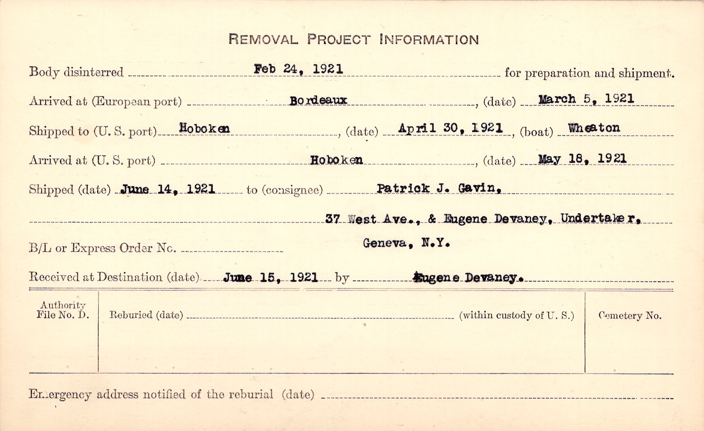 to Patrick J. Gavin, 37 West Ave., & Eugene Devaney, Undertaker, Geneva, N.Y.