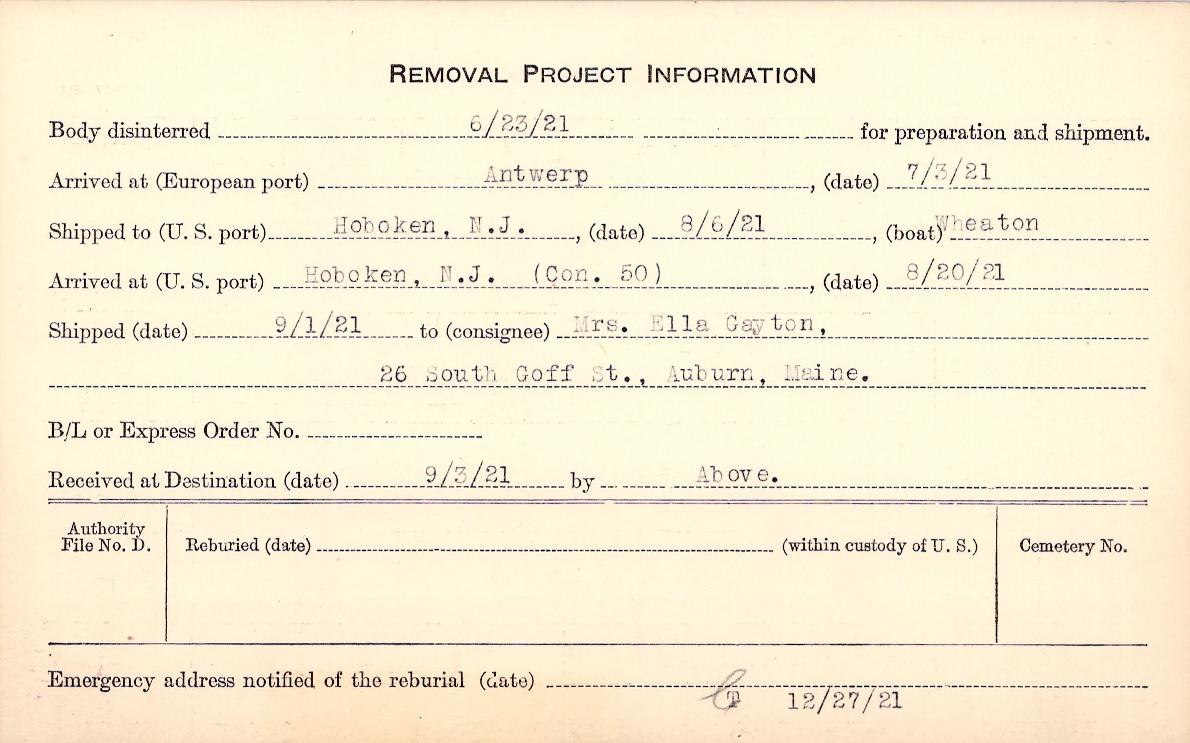 Body disinterred 6/23/1921 for preparation and shipment.