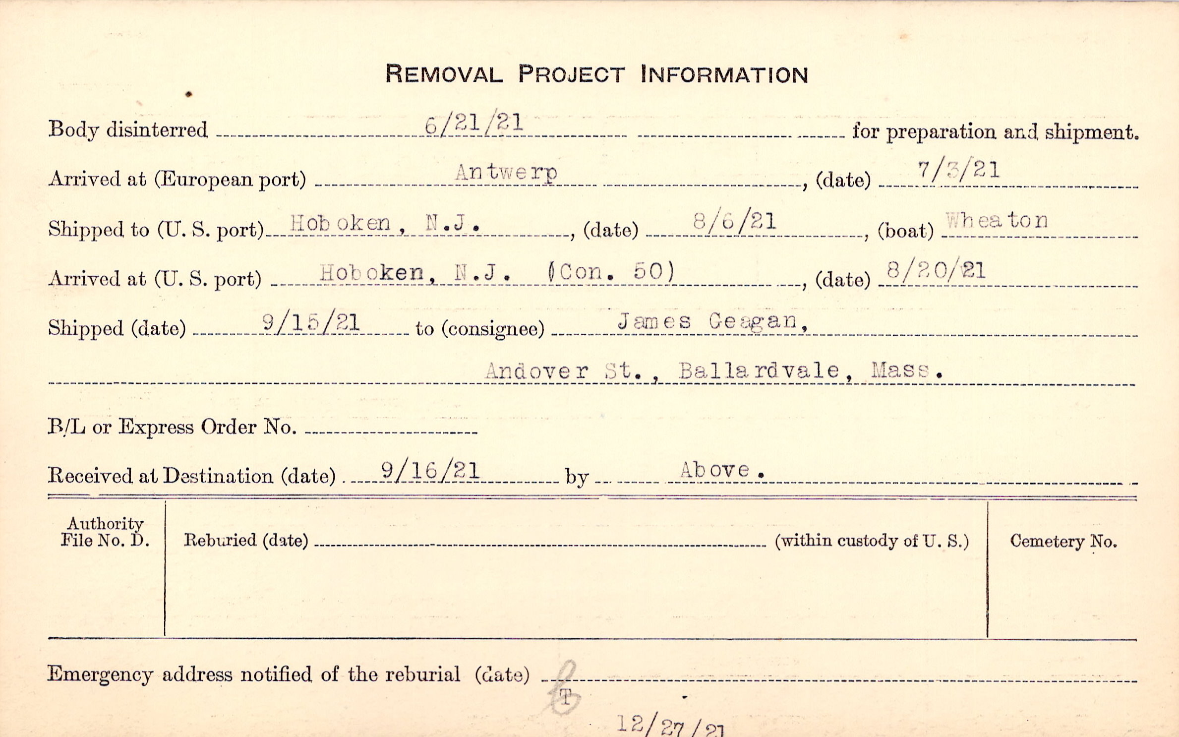 Body disinterred 6/21/1921 for preparation and shipment.