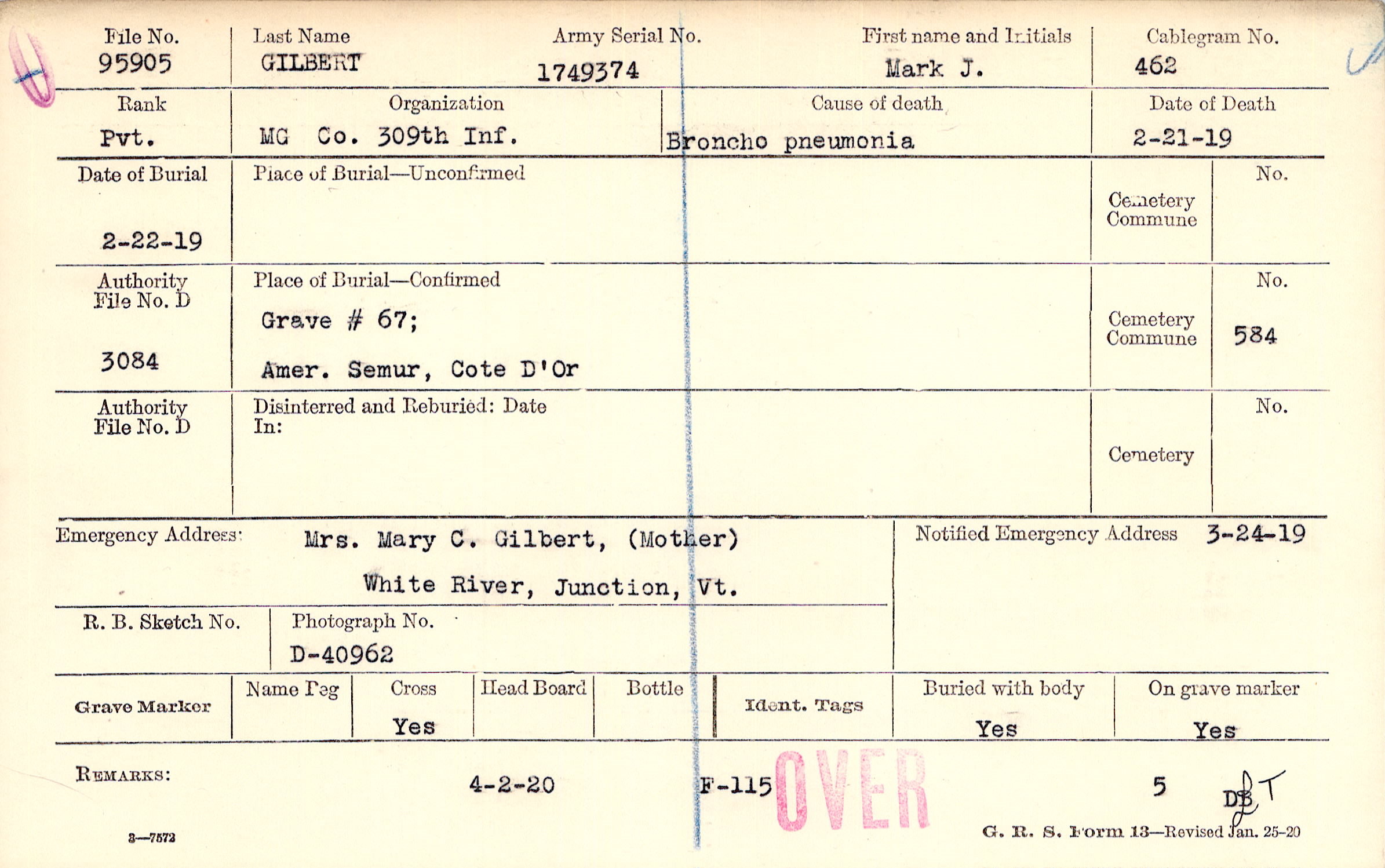 Mrs. Mary C. Gilbert, (Mother), White River, Junction, Vt.