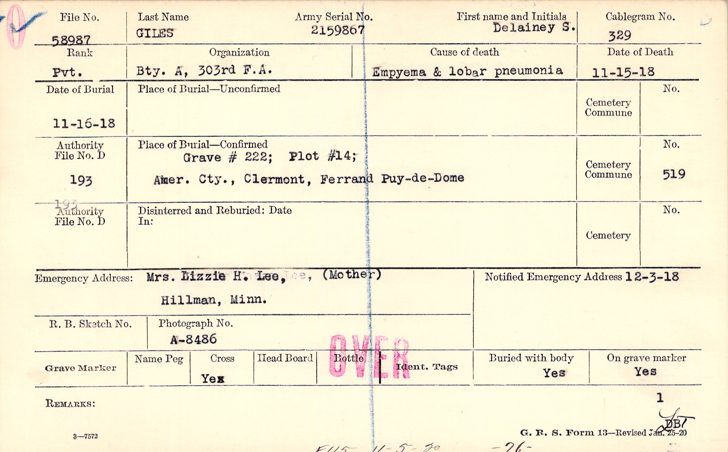 Grave # 222; Plot #14; Amer. Cty., Clermont, Ferrand Puy-de-Dome