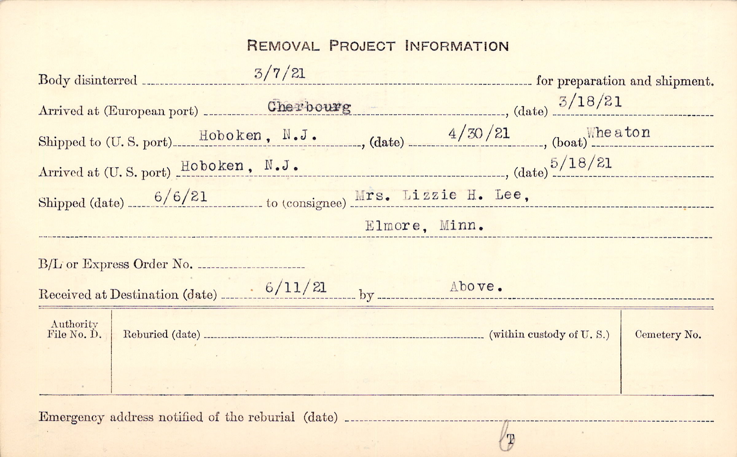 Body disinterred 3/7/1921 for preparation and shipment.