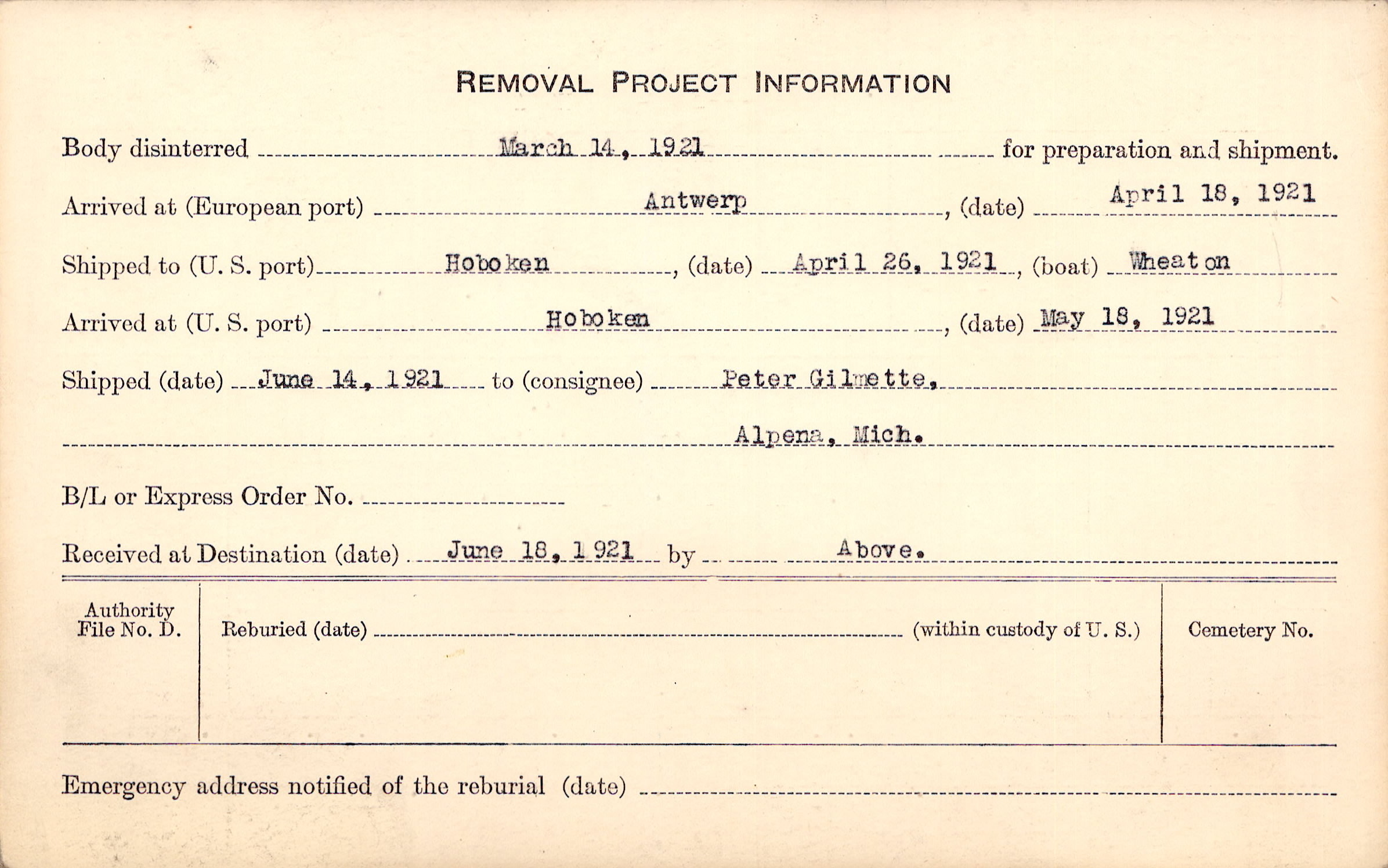 Body disinterred 3/14/1921 for preparation and shipment.