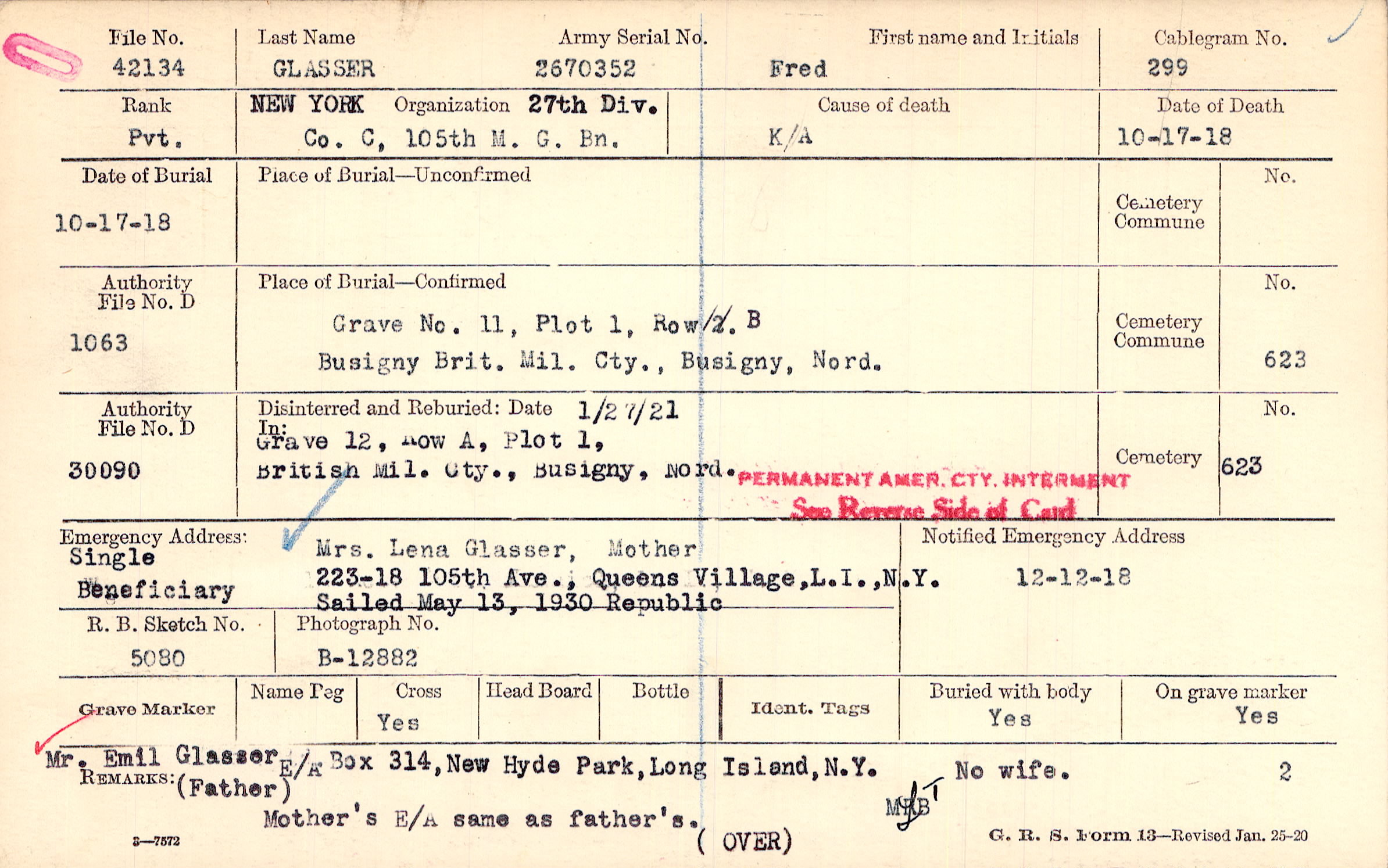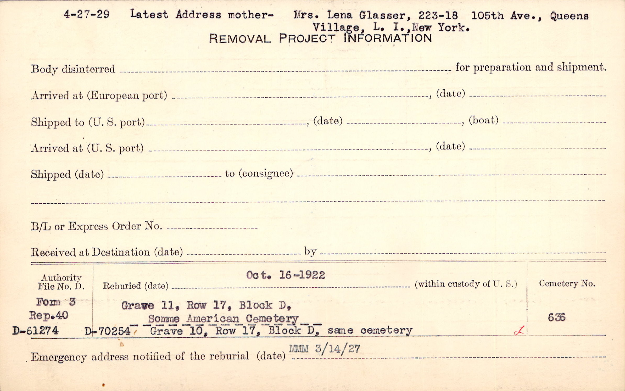 Latest Address mother - Mrs. Lena Glasser, 223-18 105th Ave., Queens Village, L. I., New York. |