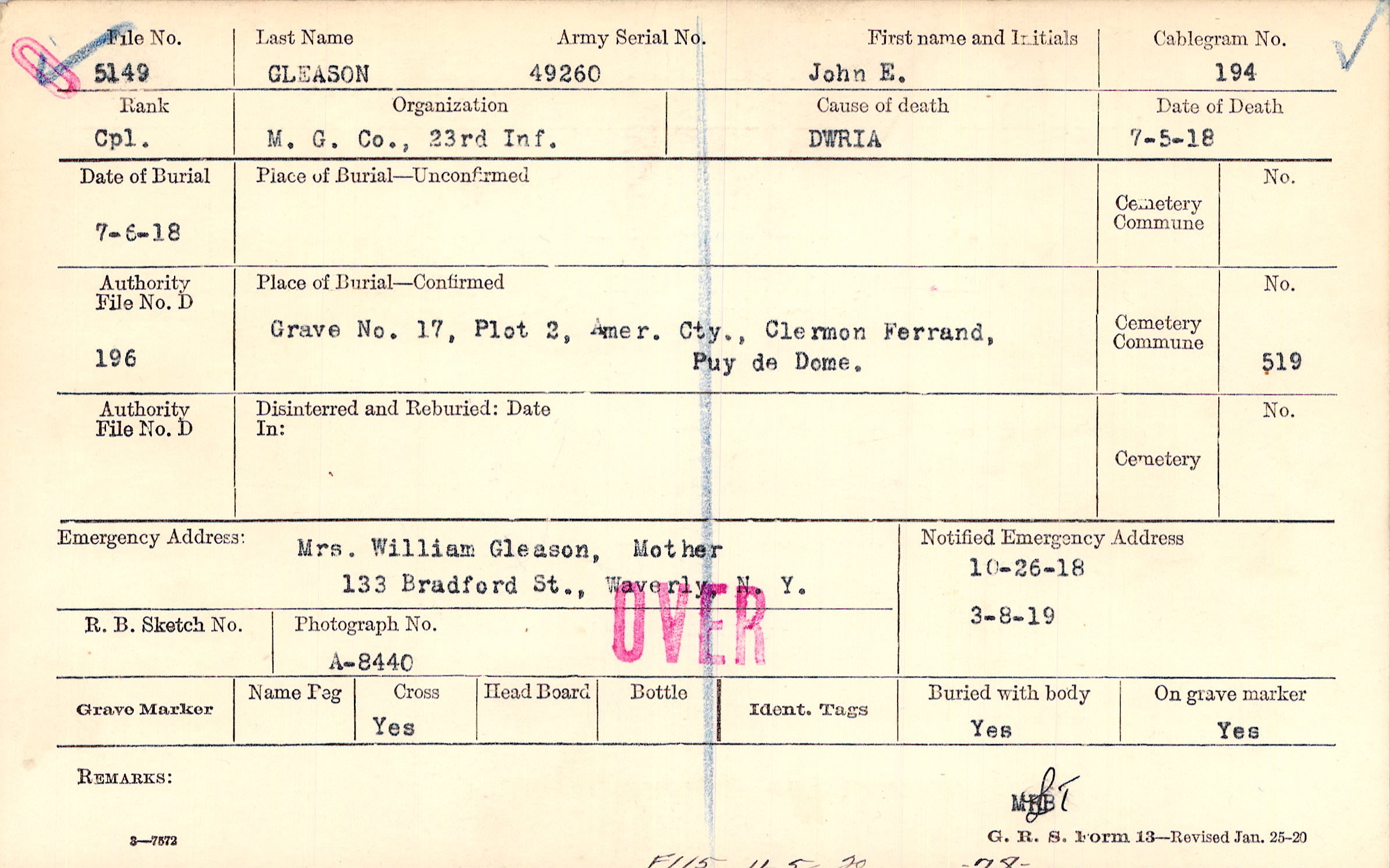 Grave 17, Plot 2, Amer. Cty., Clermon Ferrand, Puy de Dome