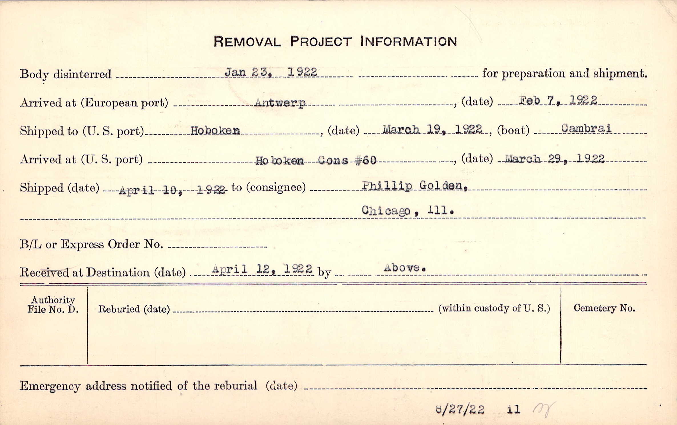 Body disinterred 1/23/1922 for preparation and shipment.