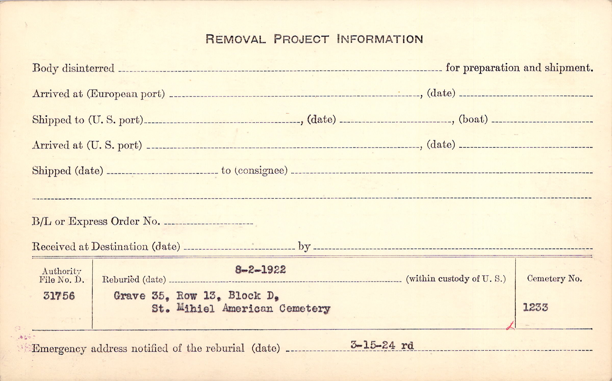 | Permanent Burial in Foreign Cemetery |