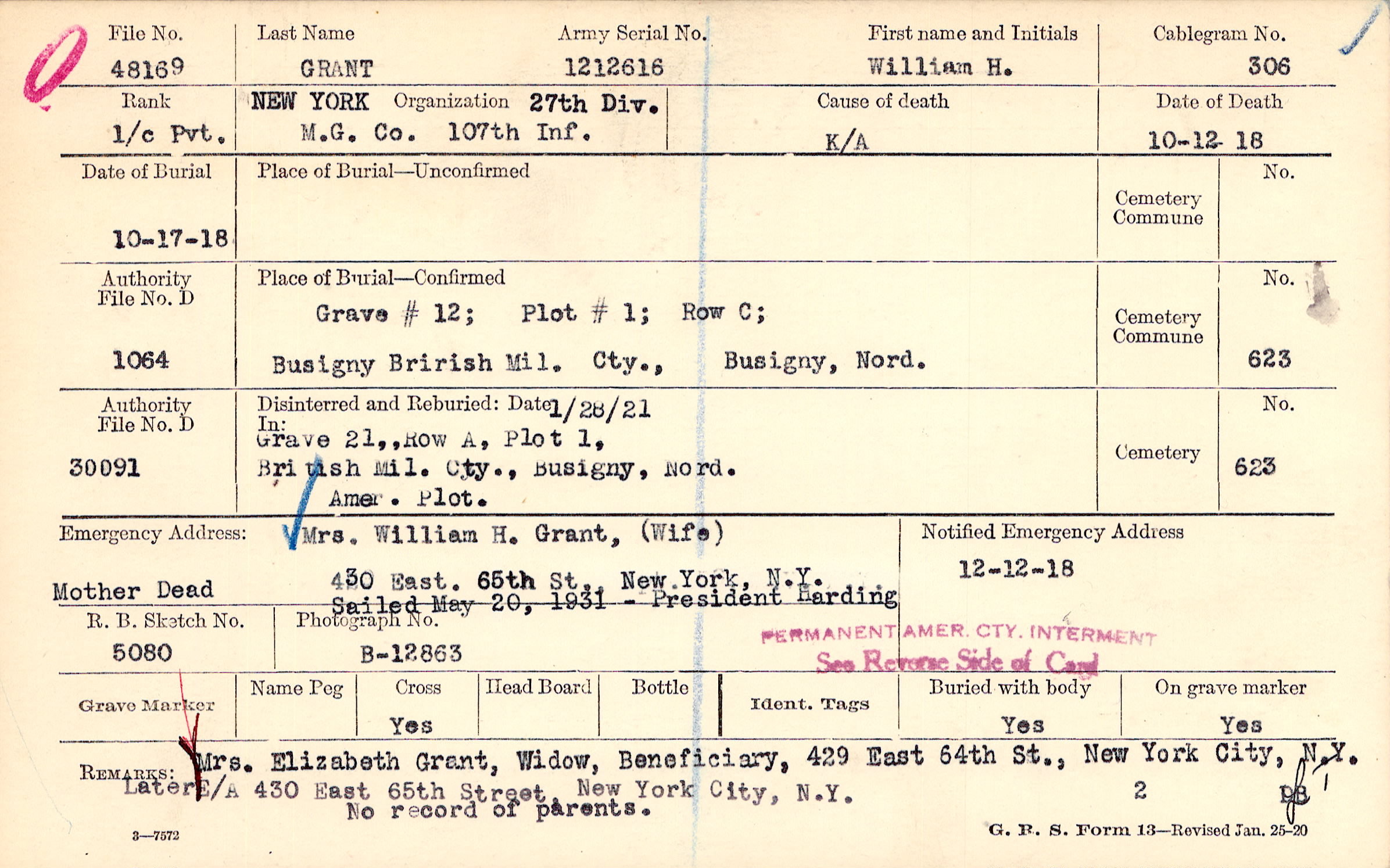 Grave # 12, Plot # 1, Row C, Busigny Brirish Mil. Cty., Busigny, Nord