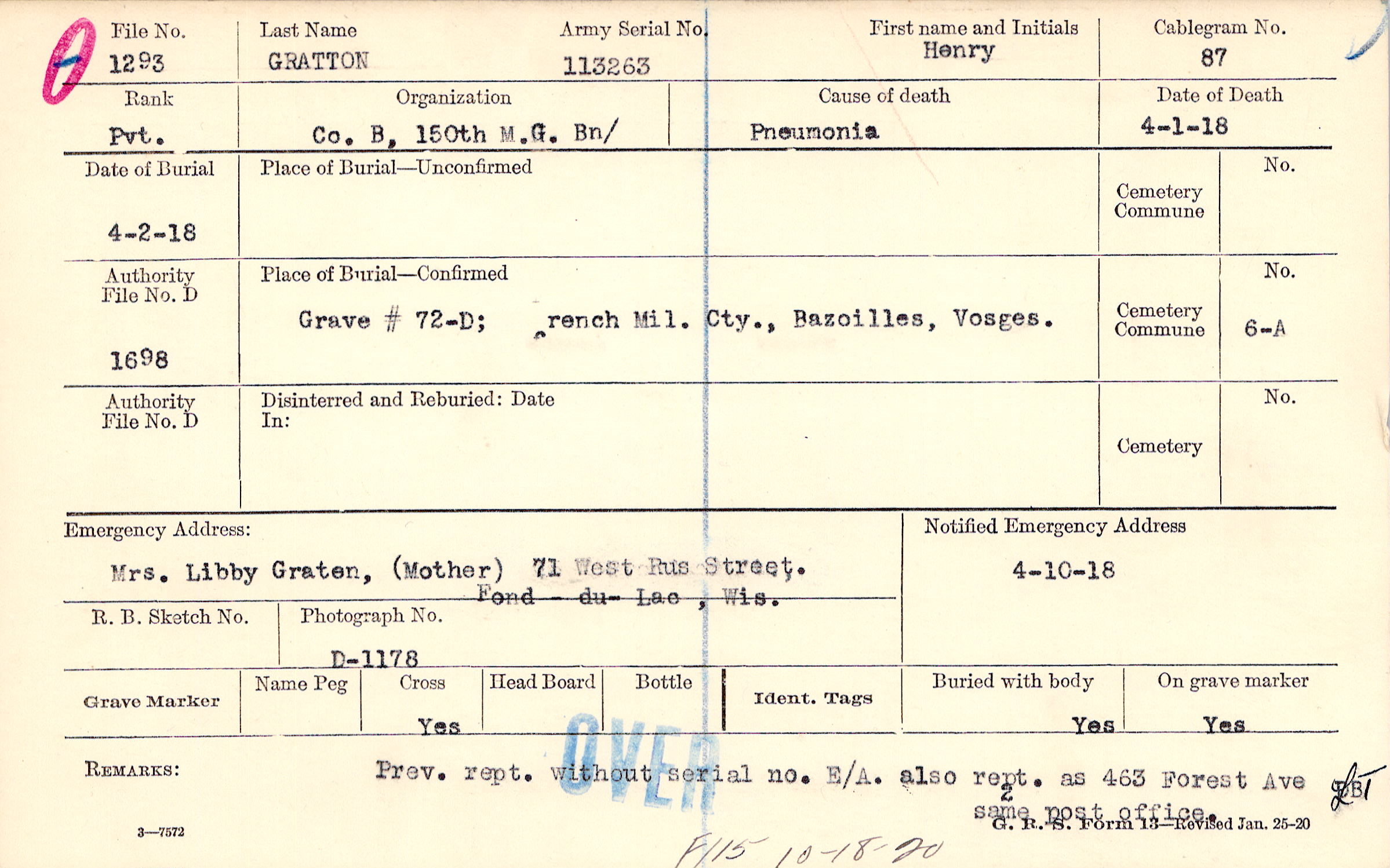 Grave # 72-D, French Mil. Cty., Bazoilles, Vosges