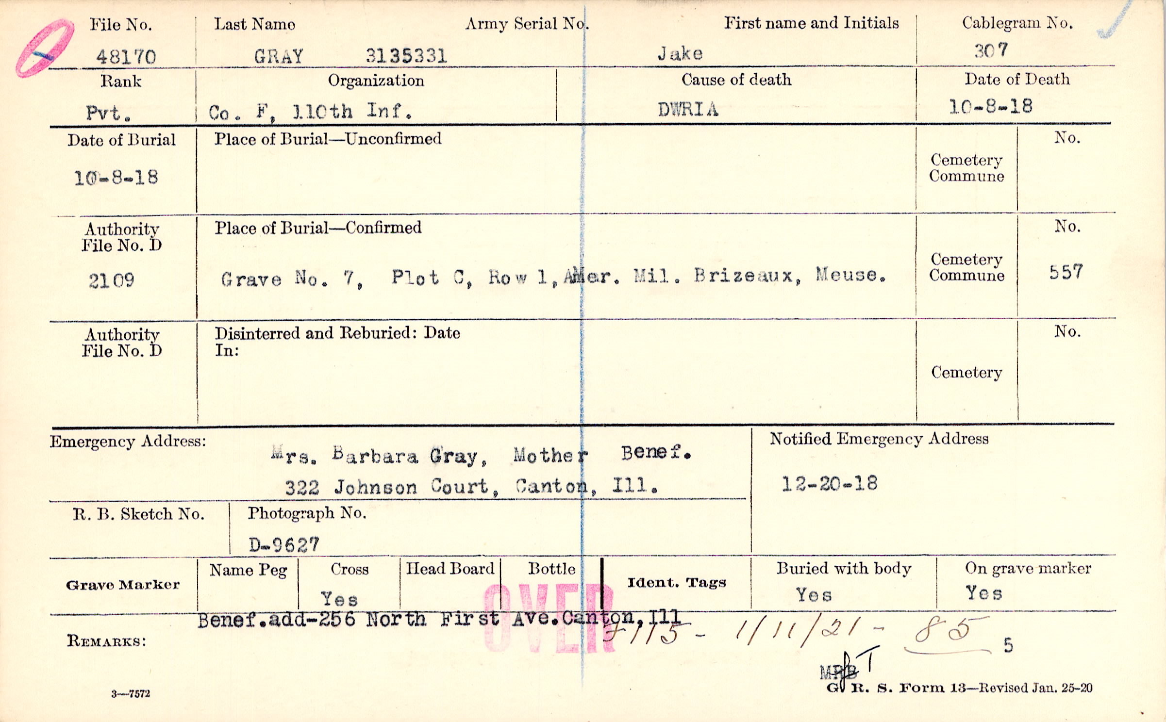 Mrs. Barbara Gray, Mother, 322 Johnson Court, Canton, Ill., Benef.
