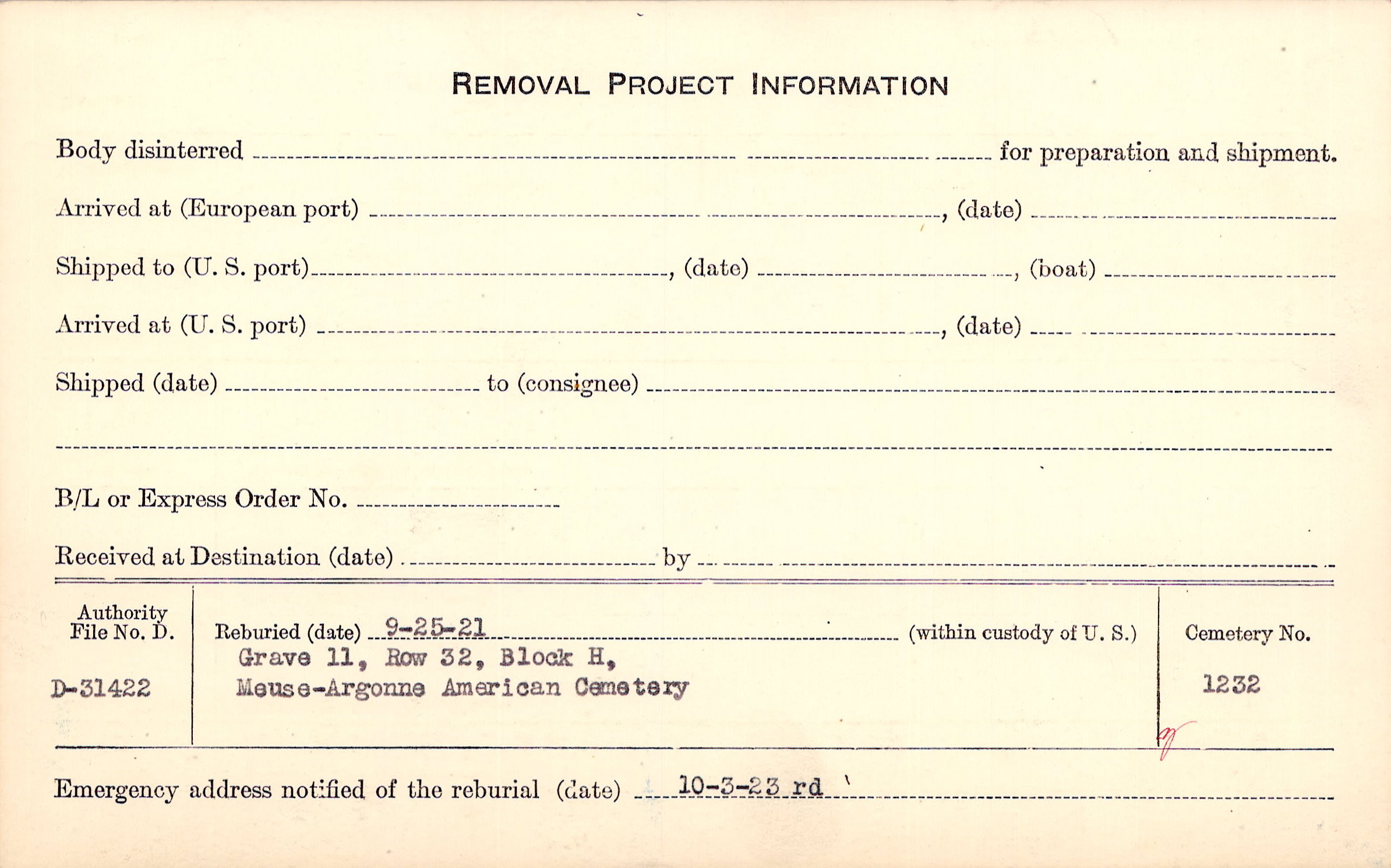 | Permanent Burial in Foreign Cemetery |