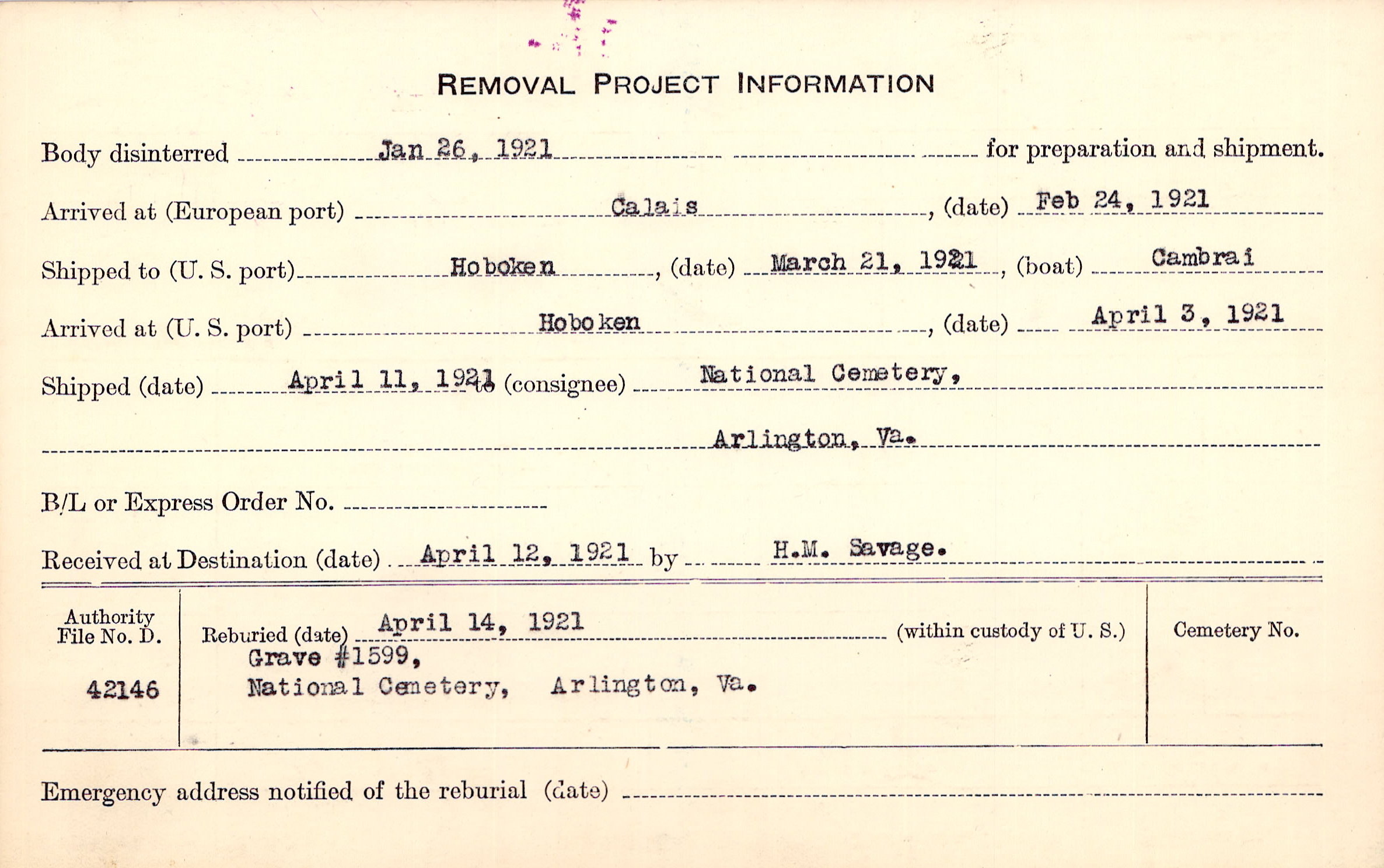 Body disinterred 1/26/1921 for preparation and shipment.