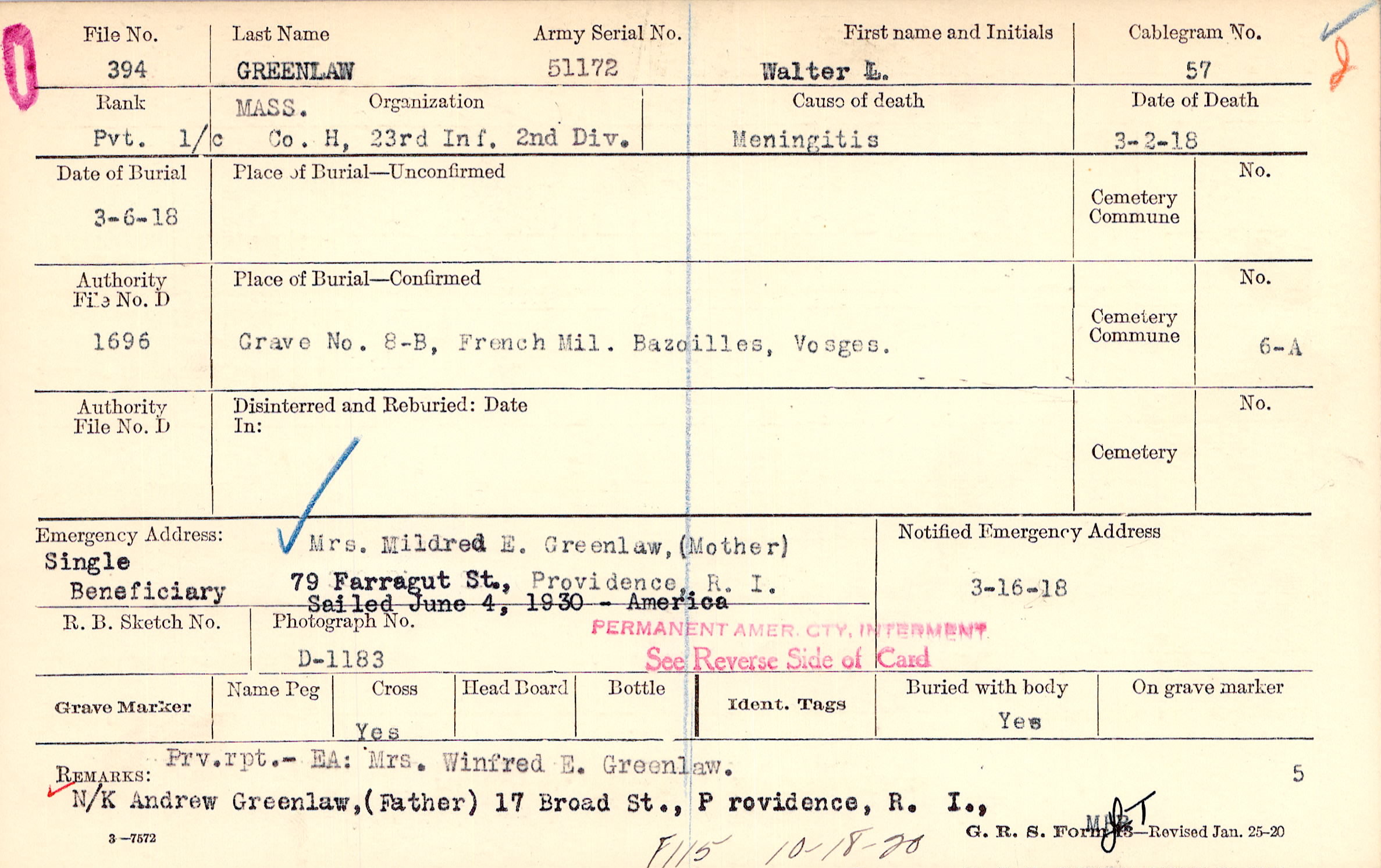 Mrs. Mildred E. Greenlaw, (Mother), 79 Farragut St., Providence, R. I., Single Beneficiary Sailed June 4, 1930 - America