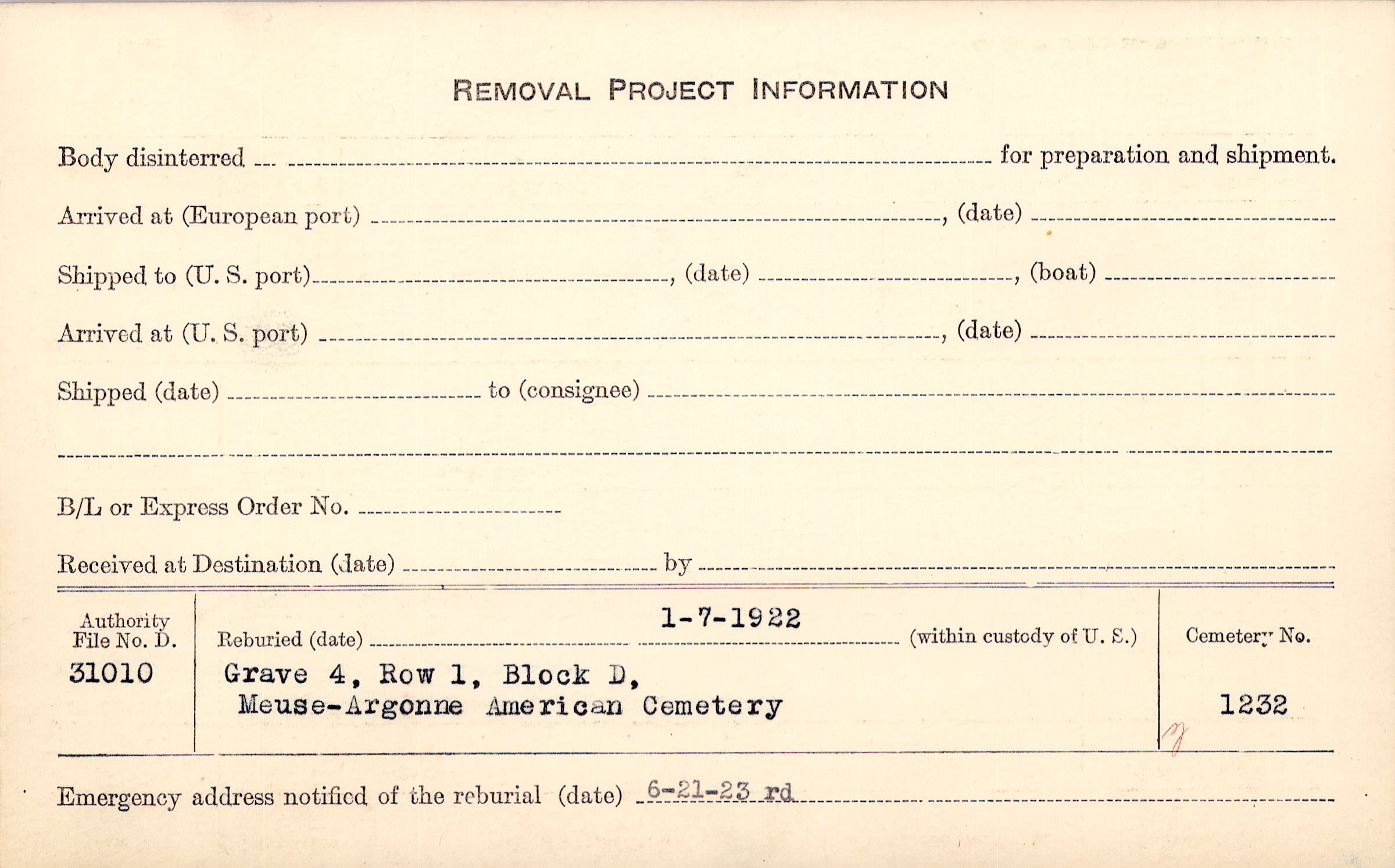 | Permanent Burial in Foreign Cemetery |