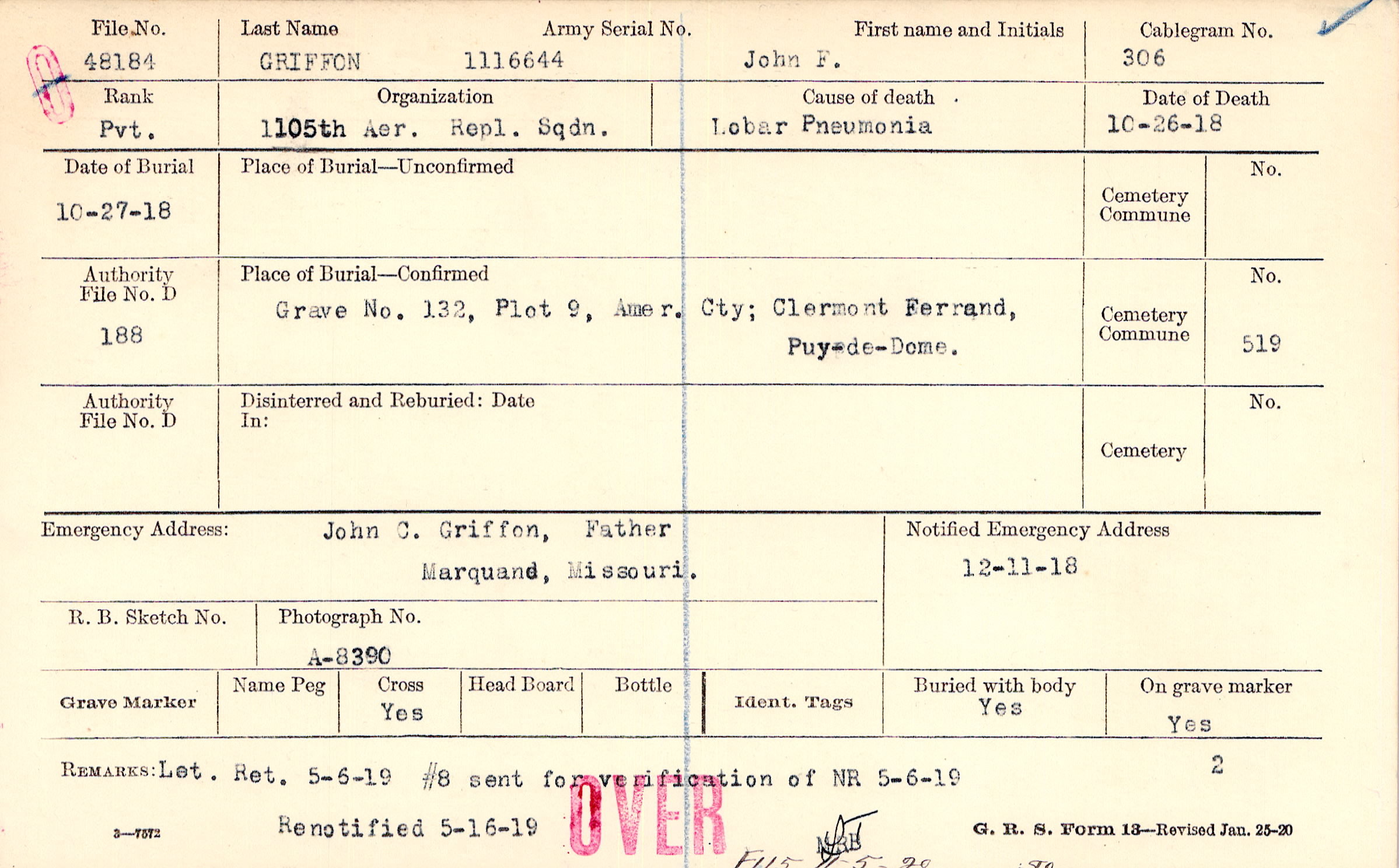 Grave 132, Plot 9, Amer. Cty., Clermont Ferrand, Puy-de-Dome