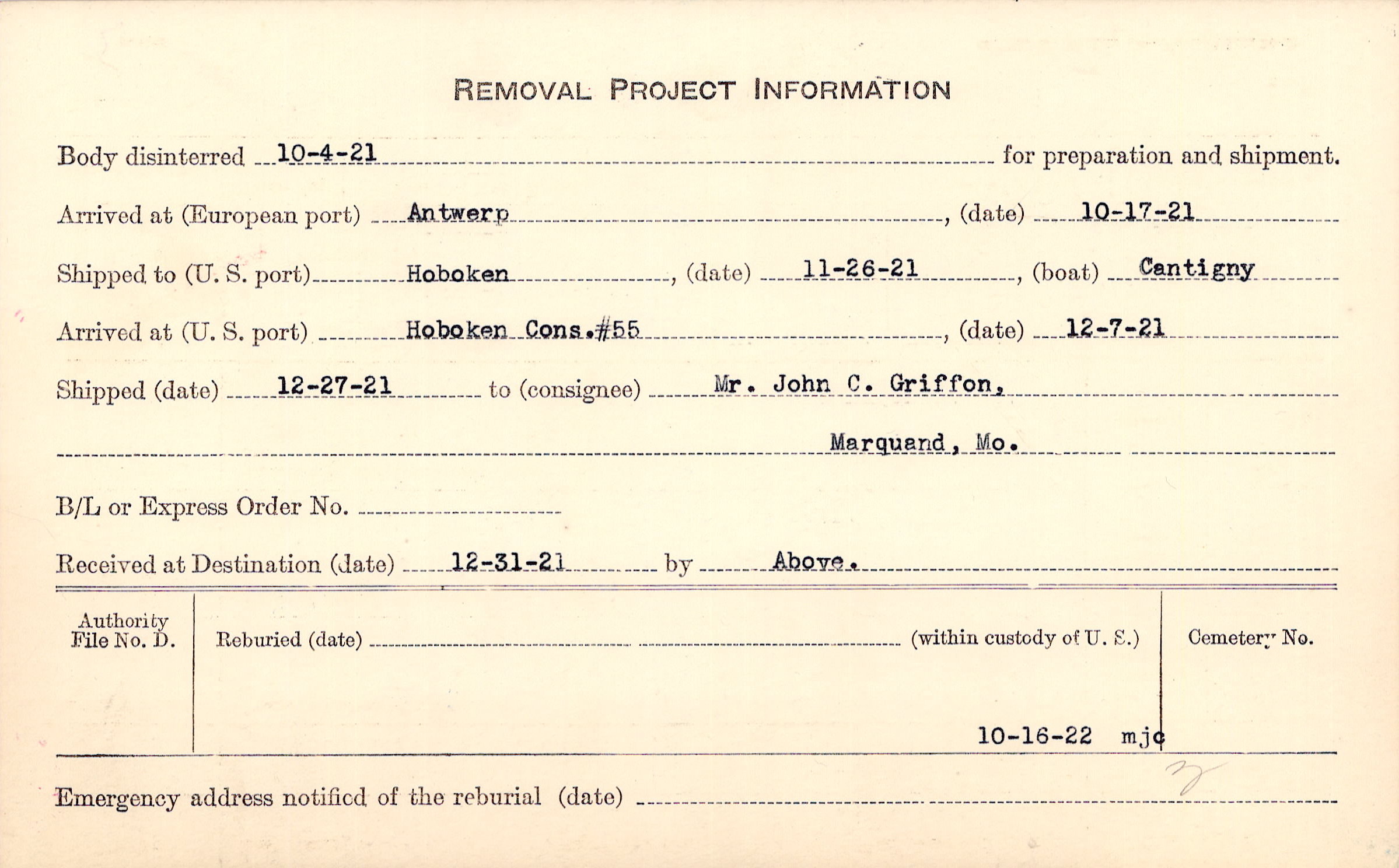 Body disinterred 10/4/1921 for preparation and shipment.