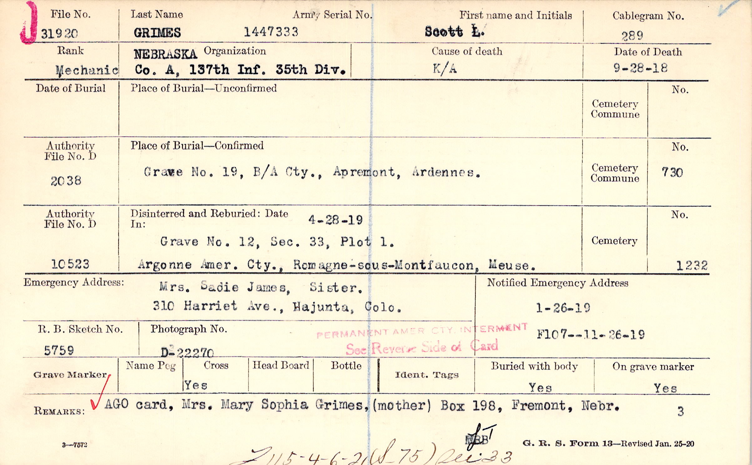 Grave 19, B/A Cty., Apremont, Ardennes.