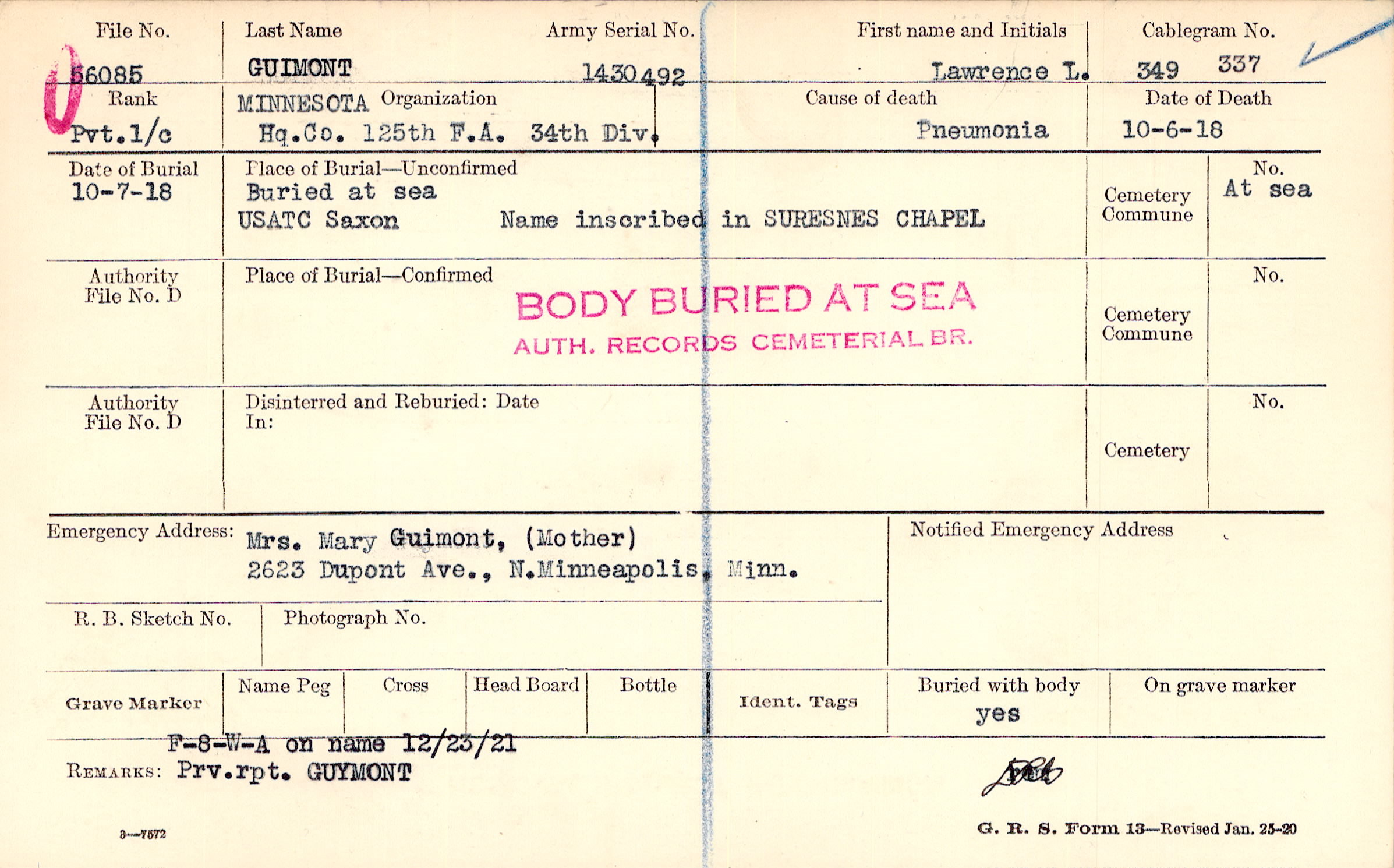 Mrs. Mary Guimont, (Mother), 2623 Dupont Ave., N.Minneapolis, Minn.