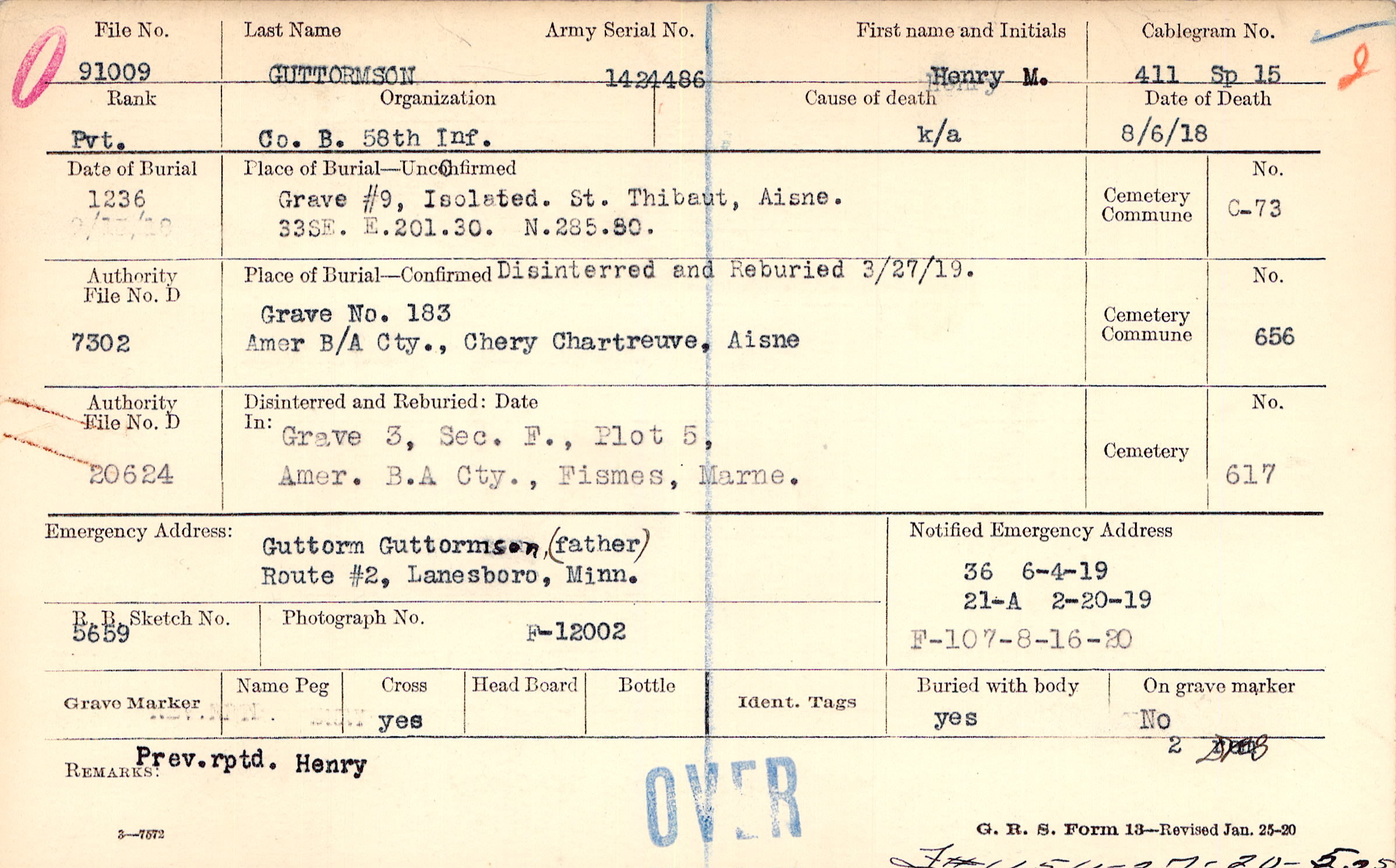 Guttorm Guttormson, (father), Route #2, Lanesboro, Minn., Prev. rptd. Henry OVER 2