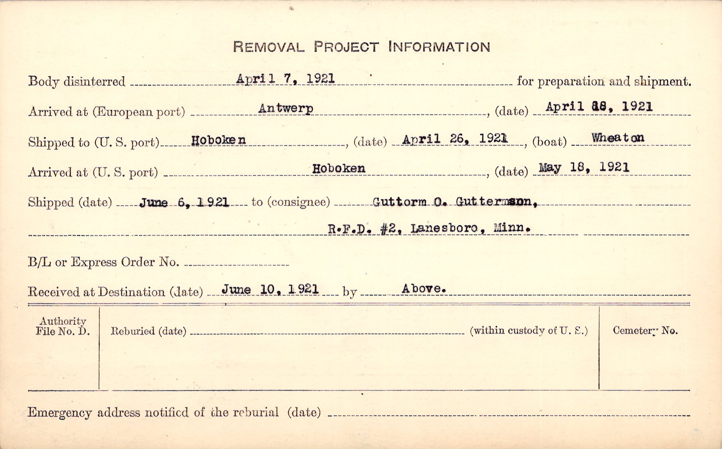 Body disinterred 4/7/1921 for preparation and shipment.