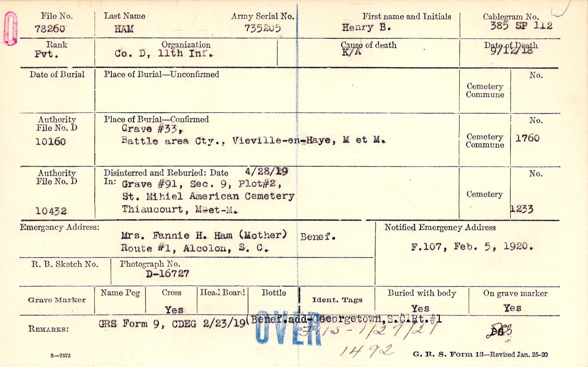 Mrs. Fannie H. Ham (Mother), Route #1, Alcolon, S.C., Benef.