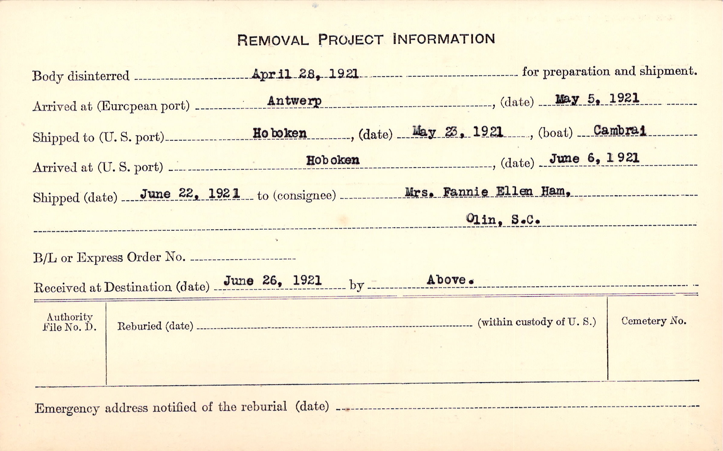 Body disinterred 4/28/1921 for preparation and shipment.