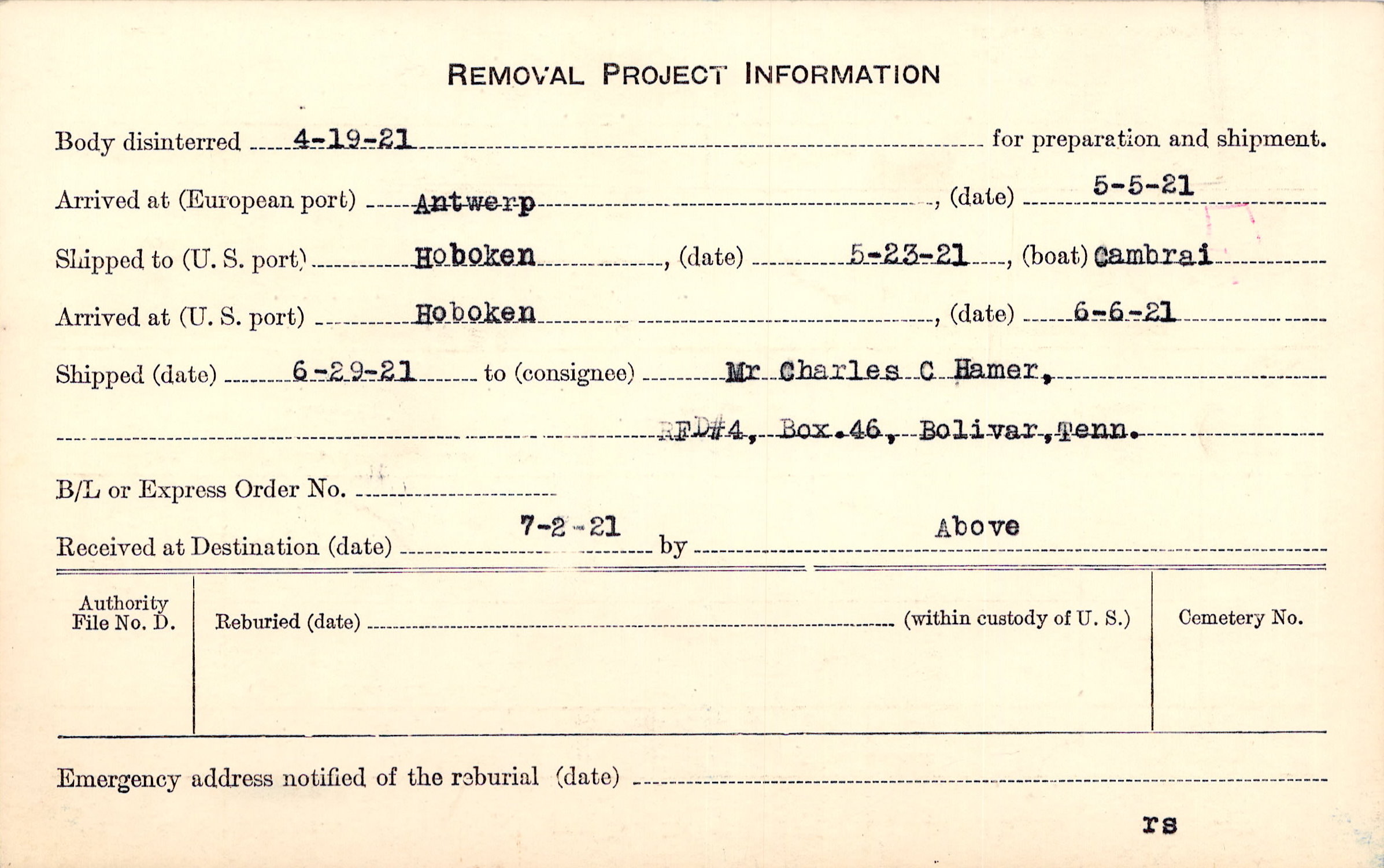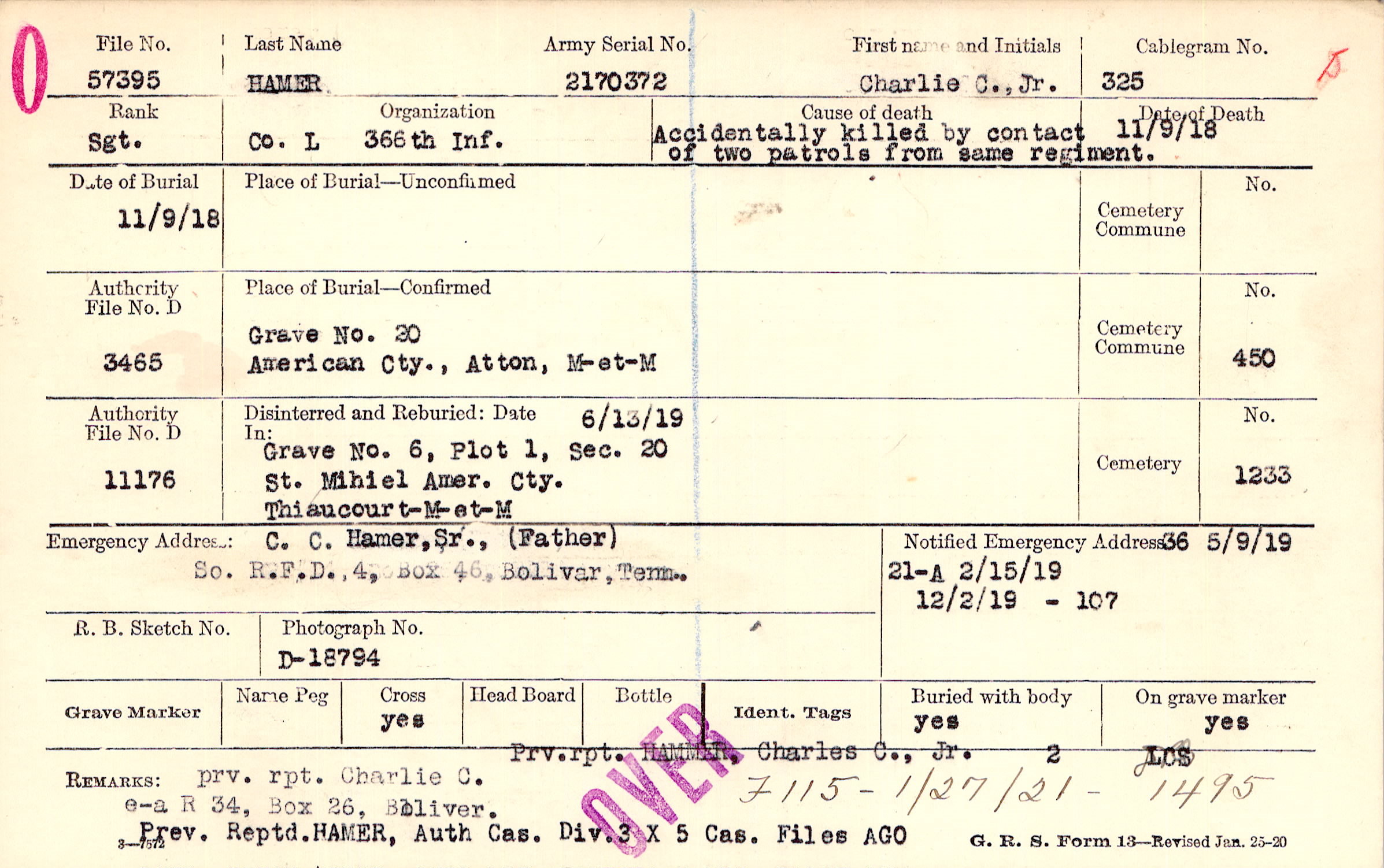 Prv. rpt. HAMMER, Charles C., Jr. prv. rpt. Charlie C. e-a R 34, Box 26, Boliver. Prev. Reptd. HAMER, Auth. Cas. Div. 3 X 5 Cas. Files AGO, Form 115 - 1/27/21 - 1495