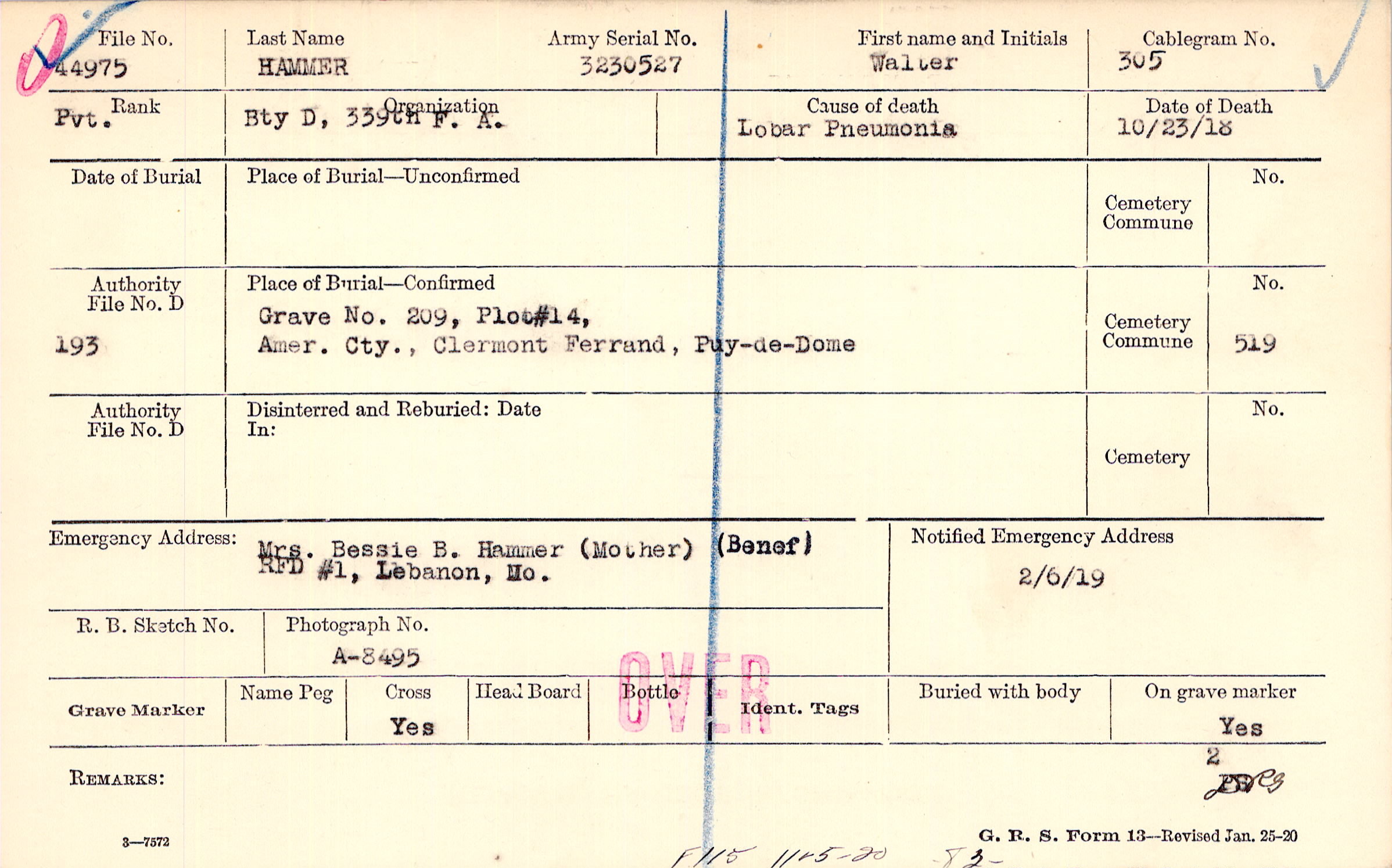 Mrs. Bessie B. Hammer (Mother), RFD #1, Lebanon, Mo., (Benef)