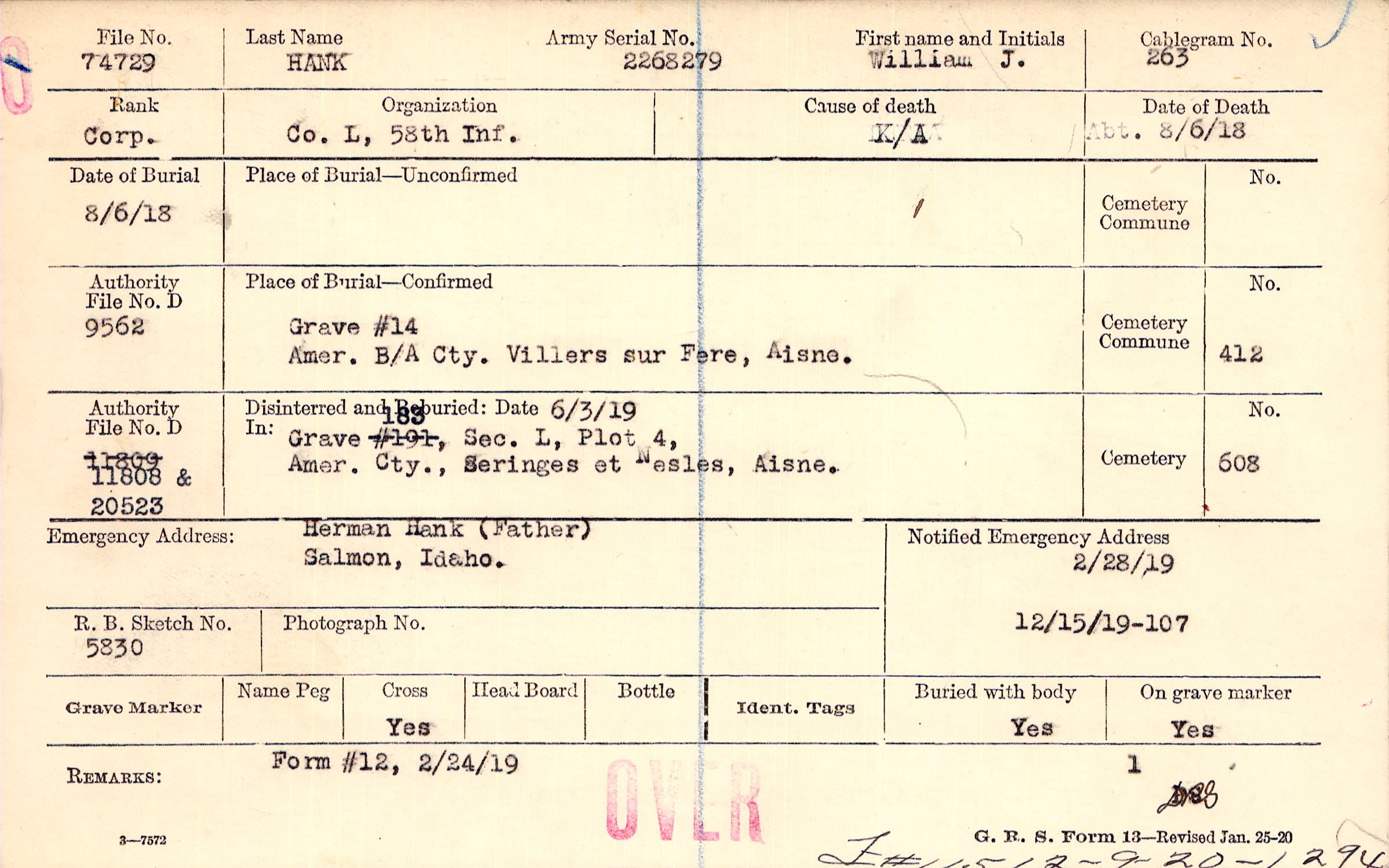 Grave #14, Amer. B/A Cty. Villers sur Fere, Aisne.