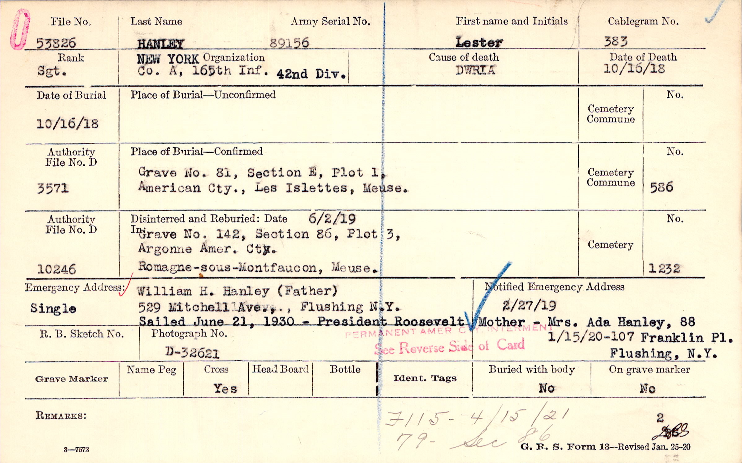 William H. Hanley (Father), 529 Mitchell Ave., Flushing N.Y., Single Sailed June 21, 1930 - President Roosevelt Mother - Mrs. Ada Hanley, 88 Franklin Pl. Flushing, N.Y.