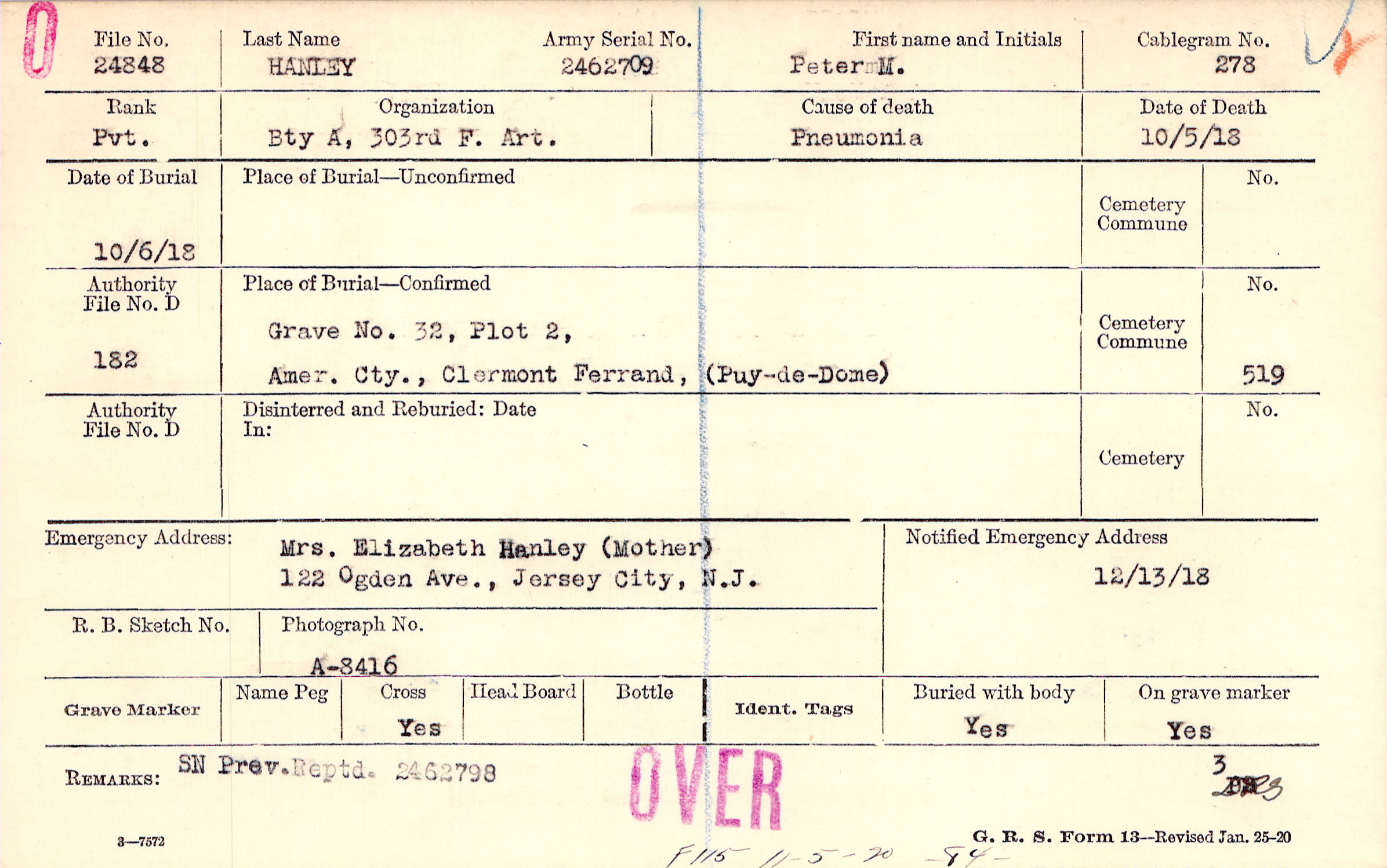 Mrs. Elizabeth Hanley (Mother), 122 Ogden Ave., Jersey City, N.J.