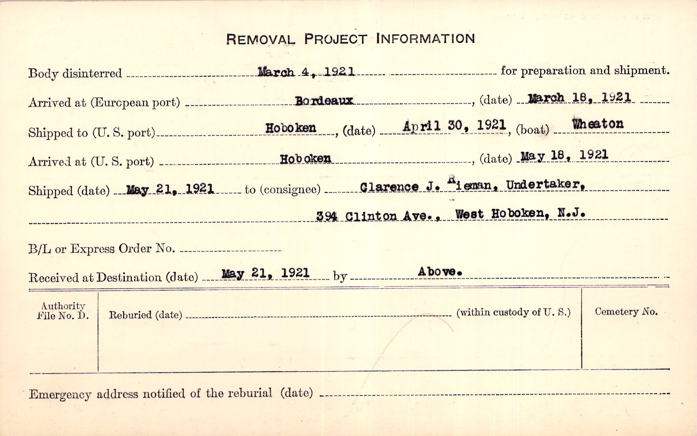 to Clarence J. Rieman, Undertaker, 394 Clinton Ave., West Hoboken, N.J.