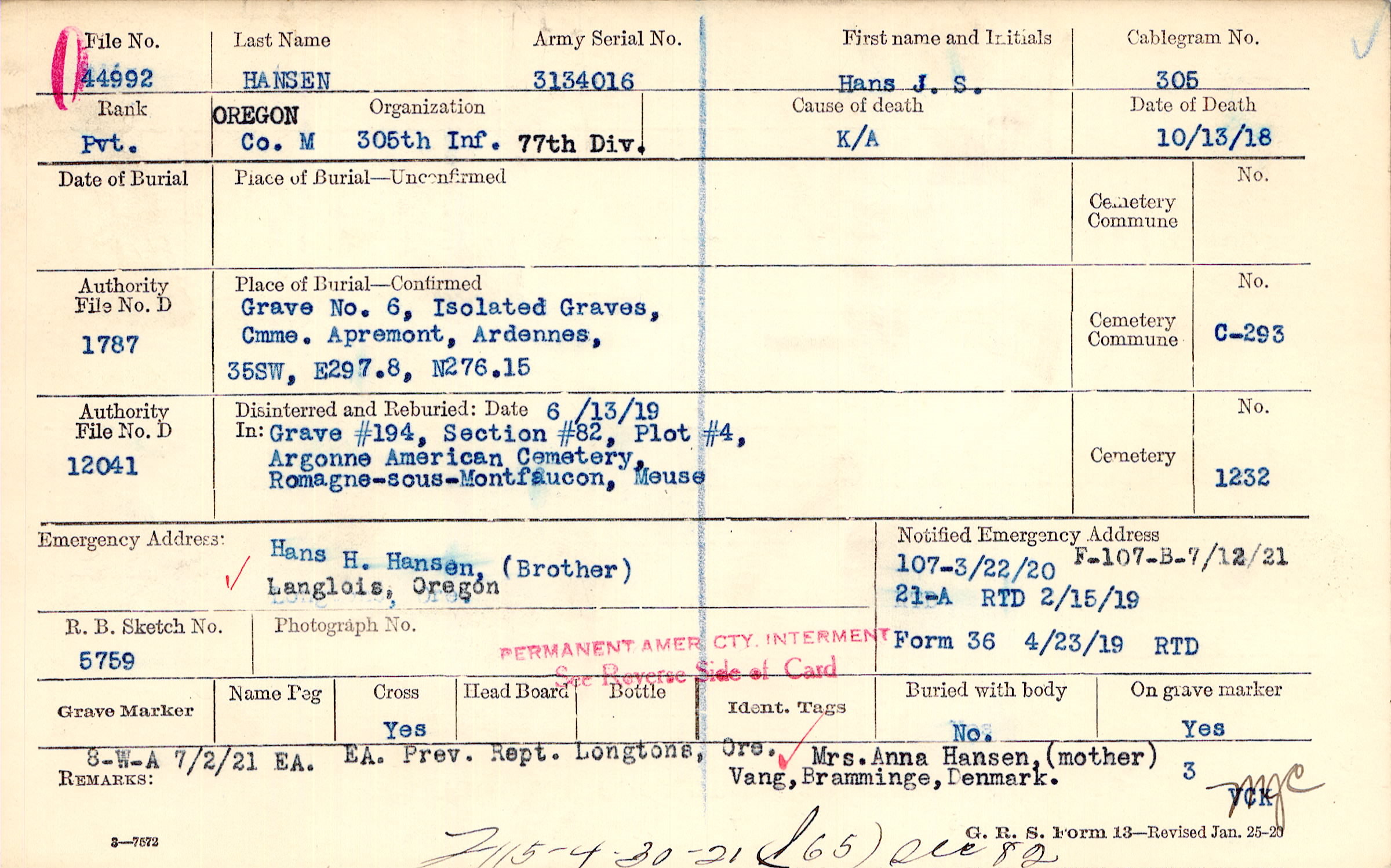 EA> Prev. Rept. Longtons, Ore. Mrs. Anna Hansen (mother) Vang, Bramminge, Denmark., 8-W-A 7/2/21 EA., F115-4-30-21 (S 65) sec 82