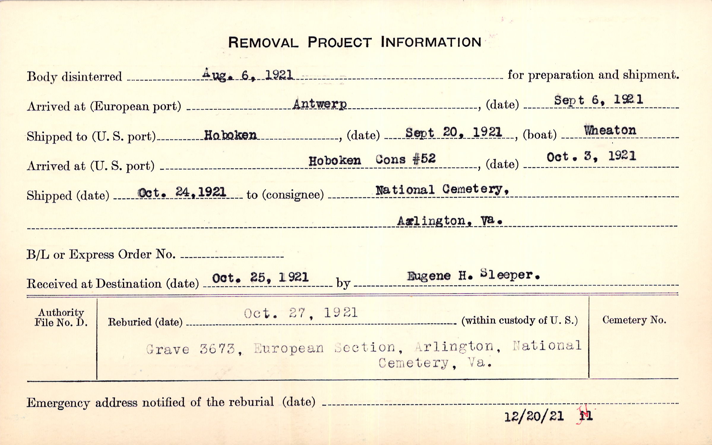 Body disinterred 8/6/1921 for preparation and shipment.