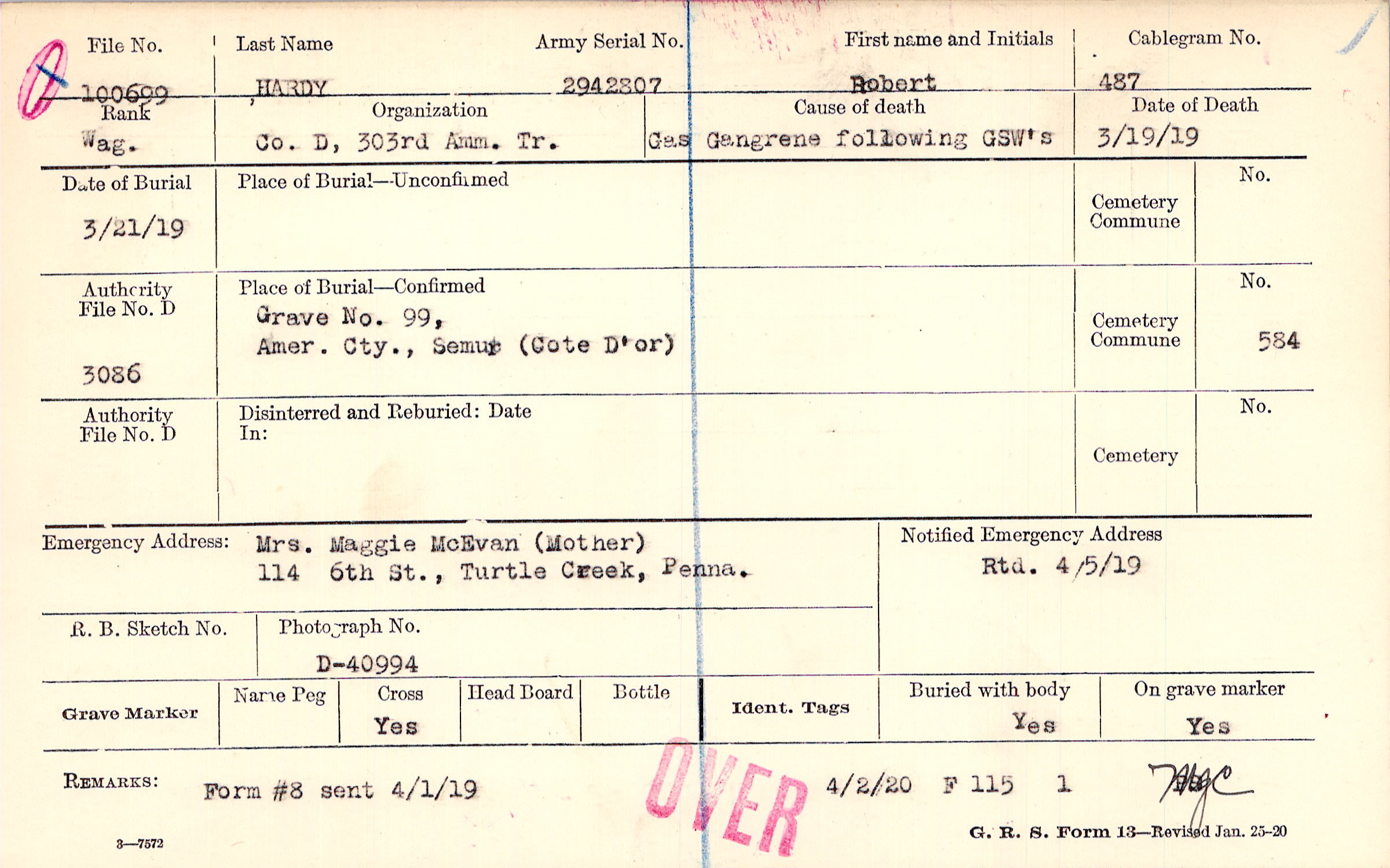 Mrs. Maggie McEvan (Mother), 114 6th St., Turtle Creek, Penna.