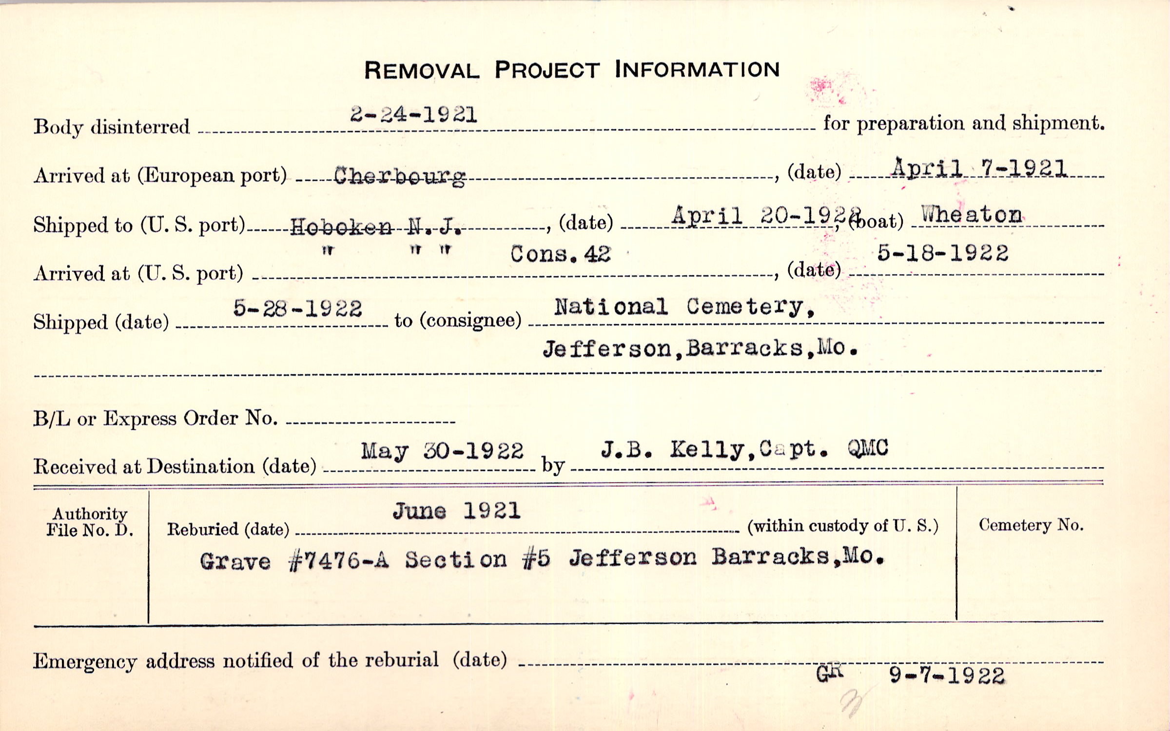 Body disinterred 2/24/1921 for preparation and shipment.
