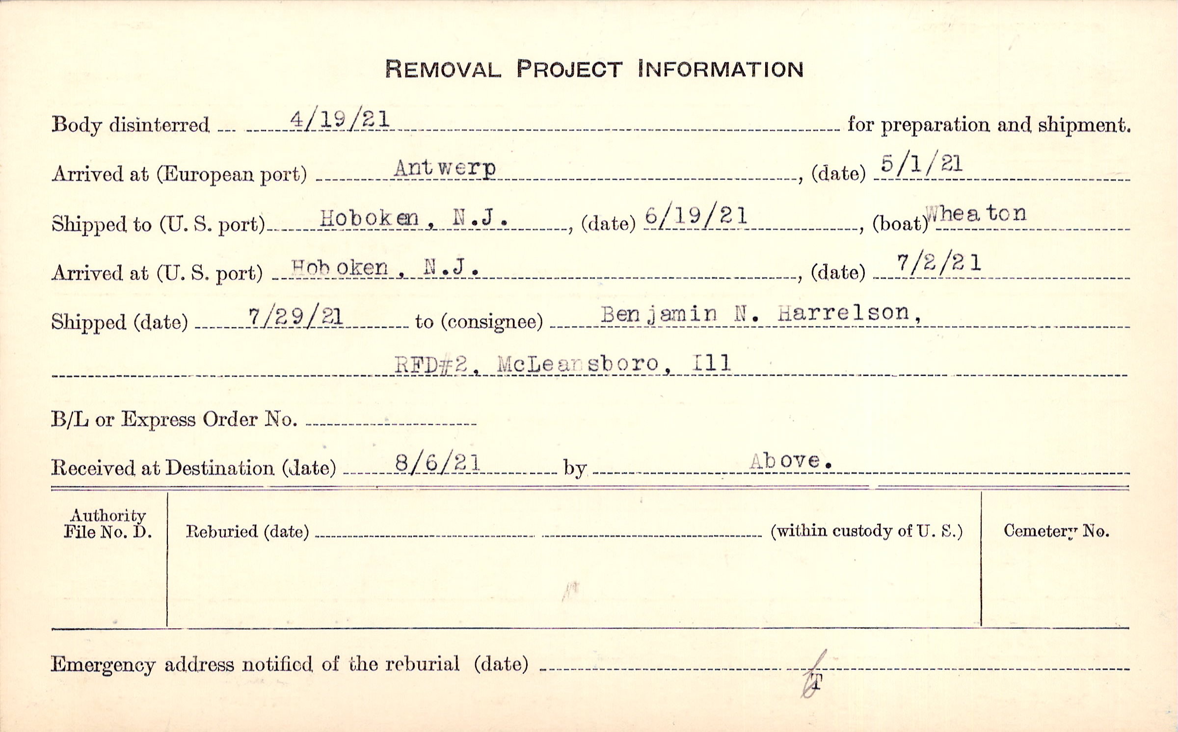 Body disinterred 4/19/1921 for preparation and shipment.