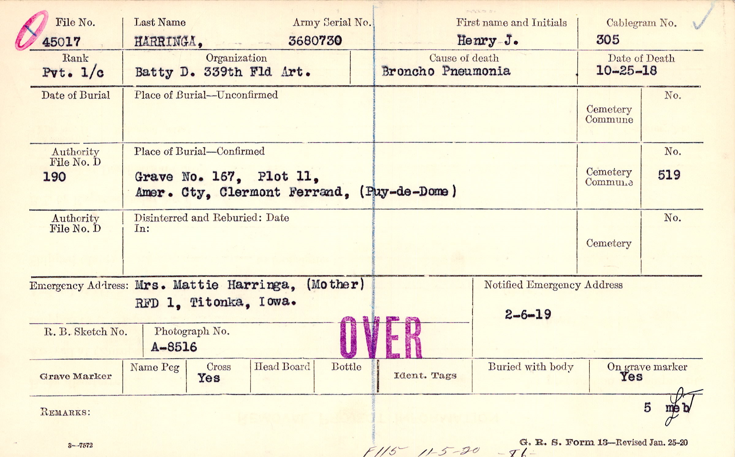 Grave 167, Plot 11,Amer. Cty., Clermont Ferrand, (Puy-de-Dome)