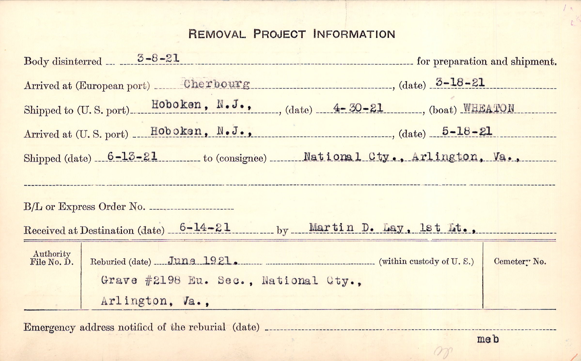 Body disinterred 3/8/1921 for preparation and shipment.