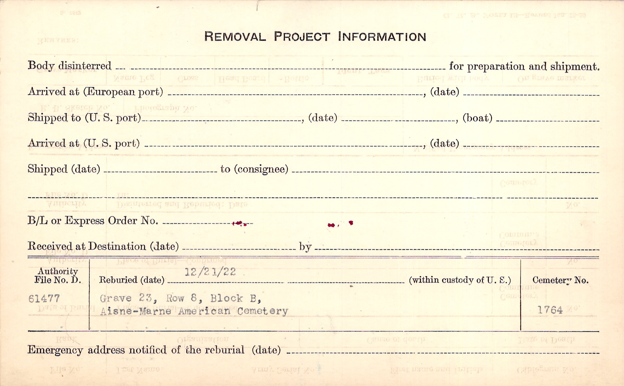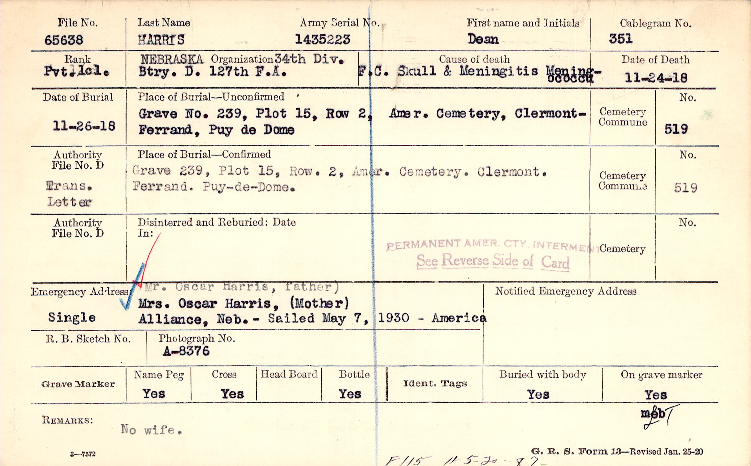 Grave No. 239, Plot 15, Row 2, Amer. Cemetery, Clermont-Ferrand, Puy de Dome