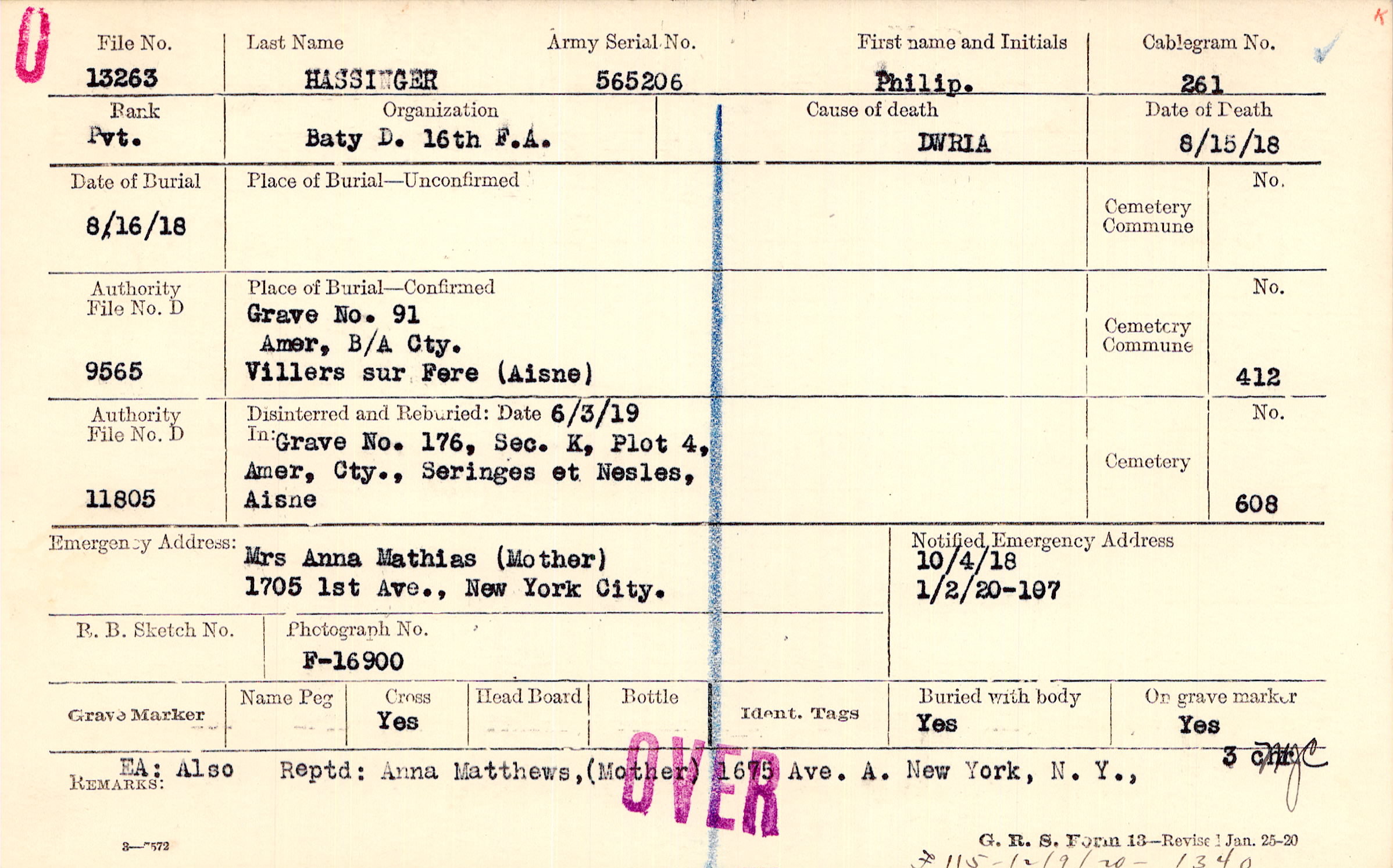 Grave 91, Amer. B/A Cty., Villers sur Fere (Aisne).